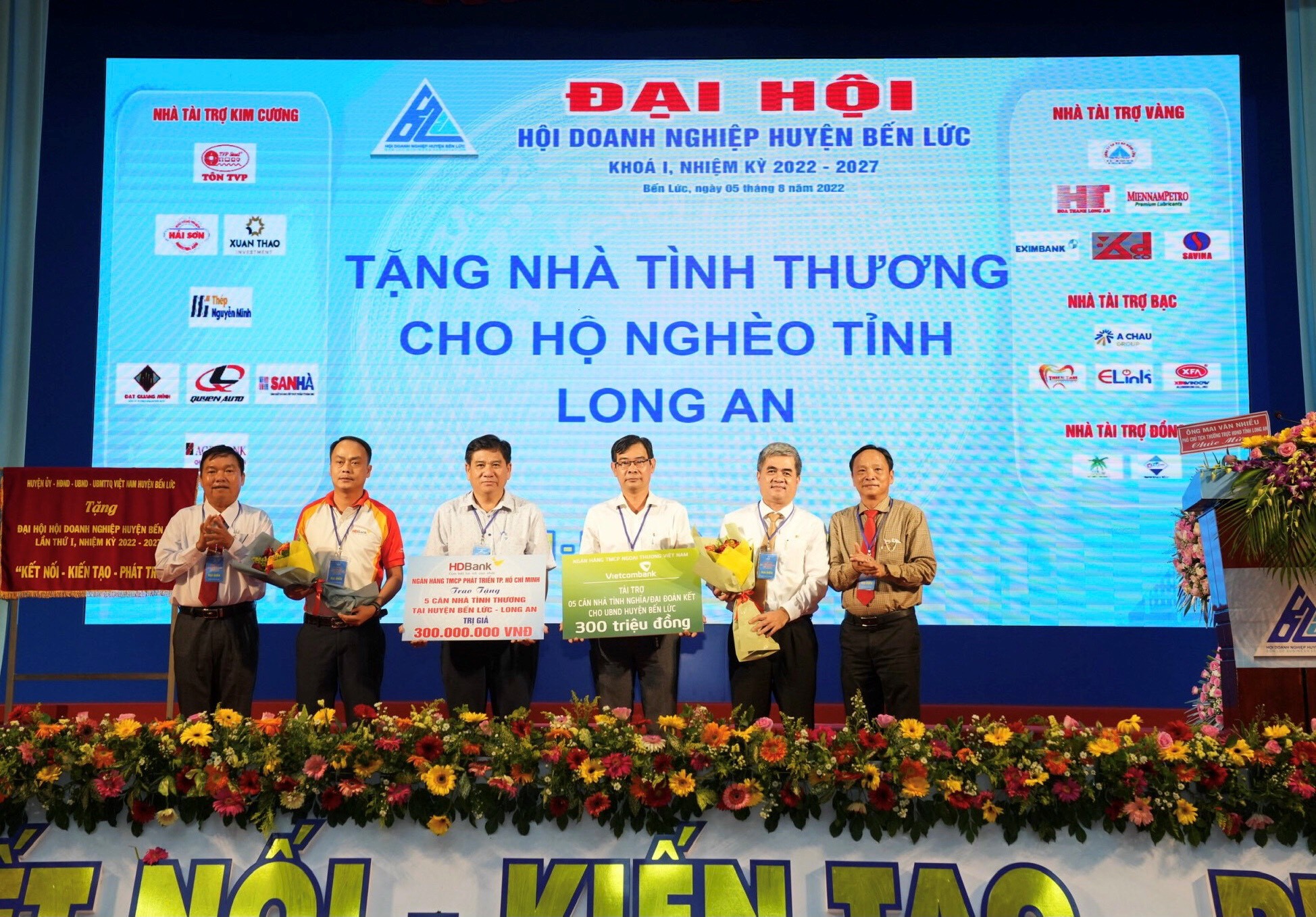 Ông Đoàn Thái Sơn - Giám đốc Vietcombank Long An (thứ 2 từ phải sang) đại diện Vietcombank trao bảng tượng trưng tài trợ 5 căn nhà trị giá 300 triệu đồng và nhận hoa cảm ơn từ lãnh đạo UBND huyện Bến Lức