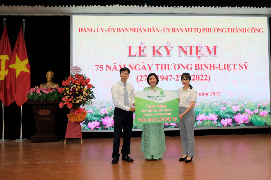 Tại buổi lễ, thay mặt Đảng ủy, Ban Giám đốc Vietcombank Sở giao dịch, bà Phạm Thị Hương Giang - Phó Giám đốc, Chủ tịch Công đoàn Vietcombank Sở giao dịch đã thăm hỏi, động viên các thương bệnh binh, gia đình chính sách và ủng hộ quỹ “Đền ơn đáp nghĩa” phường Thành Công số tiền 50 triệu đồng.