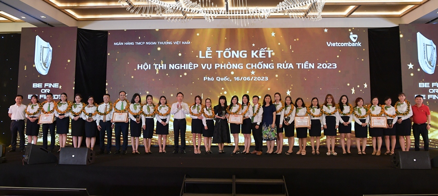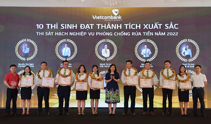 Phó Tổng Giám đốc Vietcombank Đinh Thị Thái (thứ 7 từ trái sang) cùng ông Đặng Kiên Định - Trưởng Ban Kiểm tra nội bộ (ngoài cùng bên phải) và ông Hà Đức Quân - Trưởng phòng Phòng chống rửa tiền (ngoài cùng bên trái) trao Giấy khen và tặng hoa cho các cán bộ xuất sắc nhất Hội thi Nghiệp vụ PCRT 2023