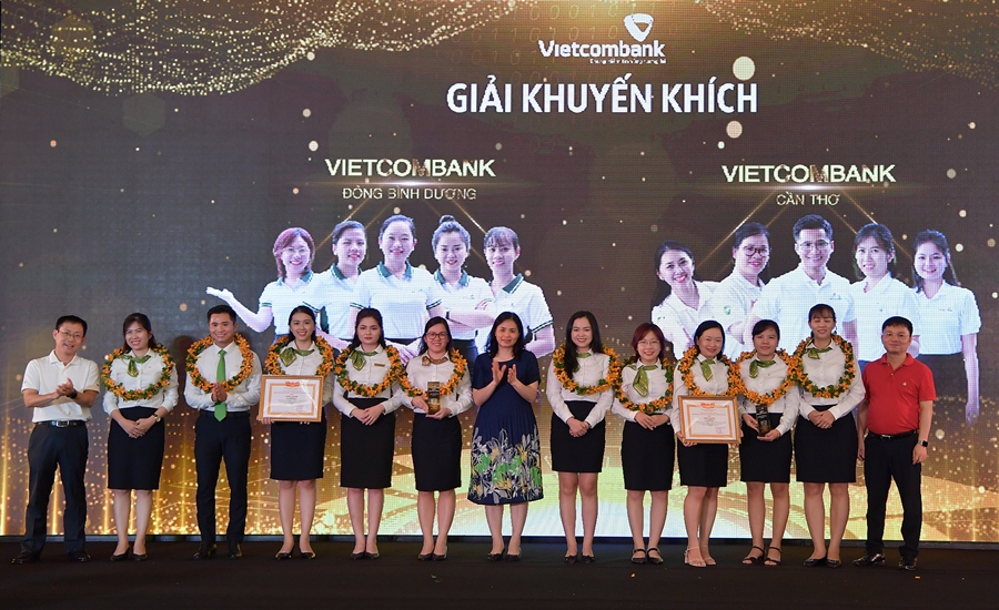 Phó Tổng Giám đốc Vietcombank Đinh Thị Thái (thứ 7 từ phải sang) cùng ông Đặng Kiên Định - Trưởng Ban Kiểm tra nội bộ (ngoài cùng bên trái) và ông Hà Đức Quân - Trưởng phòng PCRT (ngoài cùng bên phải) trao giải Khuyến khích và tặng hoa cho Vietcombank Đông Bình Dương và Vietcombank Cần Thơ