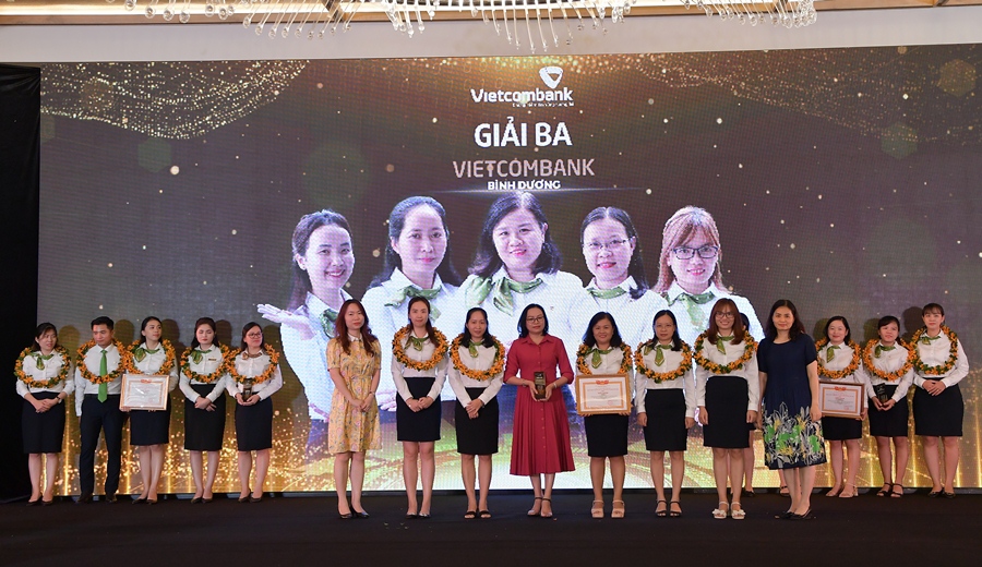 Phó Tổng Giám đốc Vietcombank Đinh Thị Thái (hàng đầu ngoài cùng bên phải) và bà Phan Hồng Nhung - Phó Giám đốc Trường ĐT&PTNNL Vietcombank (hàng đầu ngoài cùng bên trái) trao giải Ba và tặng hoa cho Vietcombank Bình Dương