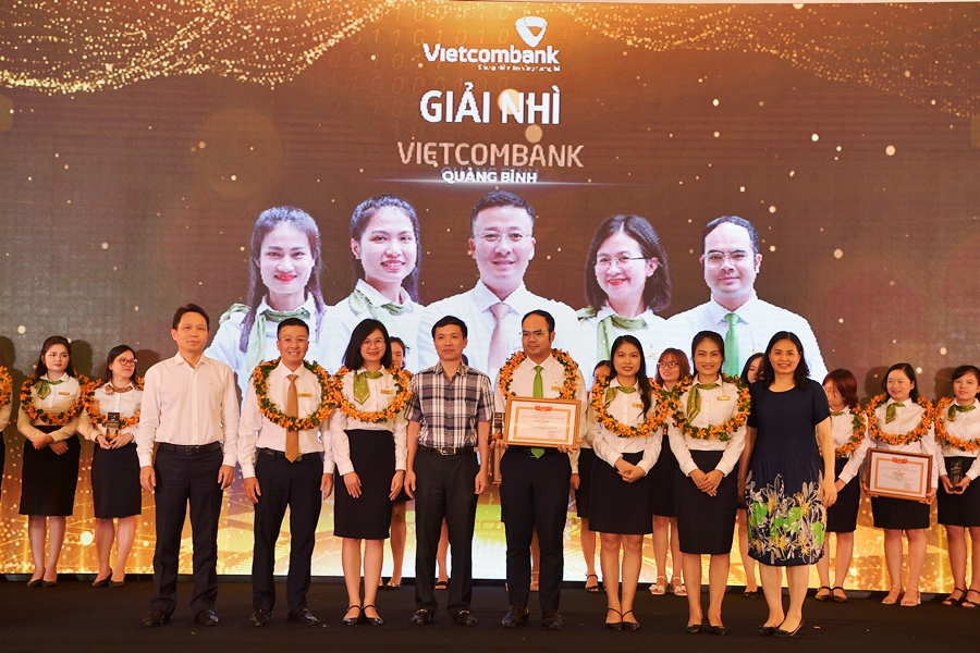 Thành viên HĐQT Vietcombank Nguyễn Mạnh Hùng (hàng đầu ngoài cùng bên trái) và Phó Tổng Giám đốc Vietcombank Đinh Thị Thái (hàng đầu ngoài cùng bên phải) trao giải Nhì và tặng hoa cho Vietcombank Quảng Bình