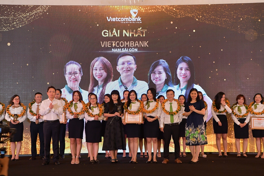 Thành viên HĐQT Vietcombank Nguyễn Mạnh Hùng (hàng đầu ngoài cùng bên trái) và Phó Tổng Giám đốc Vietcombank Đinh Thị Thái (hàng đầu ngoài cùng bên phải) trao giải Nhất và tặng hoa cho Vietcombank Nam Sài Gòn
