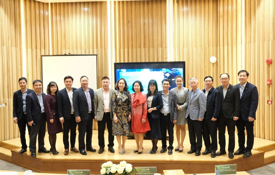Bà Nguyễn Thị Kim Oanh - Phó Tổng Giám đốc Vietcombank (thứ 7 từ trái sang) chụp ảnh lưu niệm cùng các đại biểu tham gia chương trình