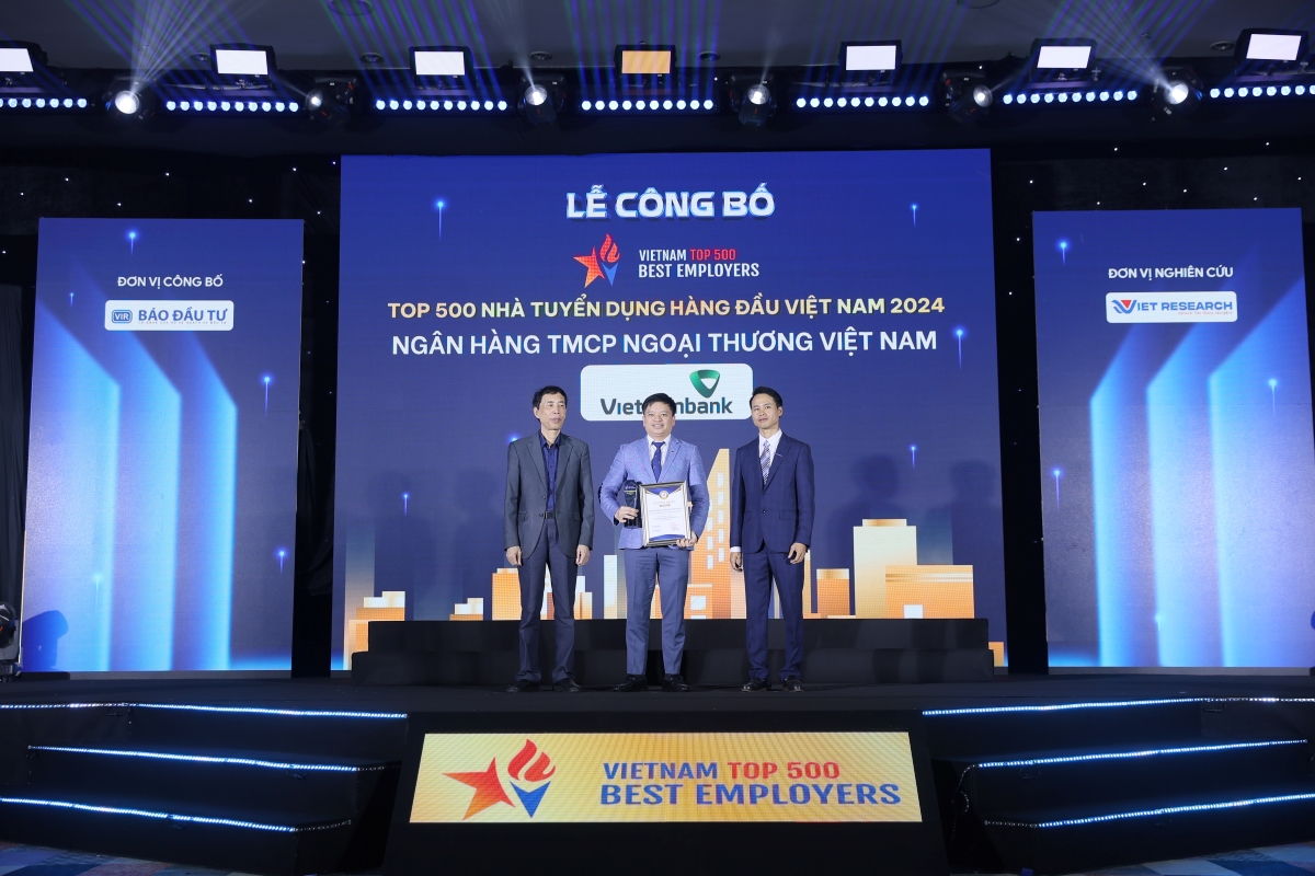 Mr. Nguyen Kien Hieu, Deputy Head of the Organization & Human Resources Department at Vietcombank (centre), received the recognition for "Top 50 Most Attractive Employers 2024"