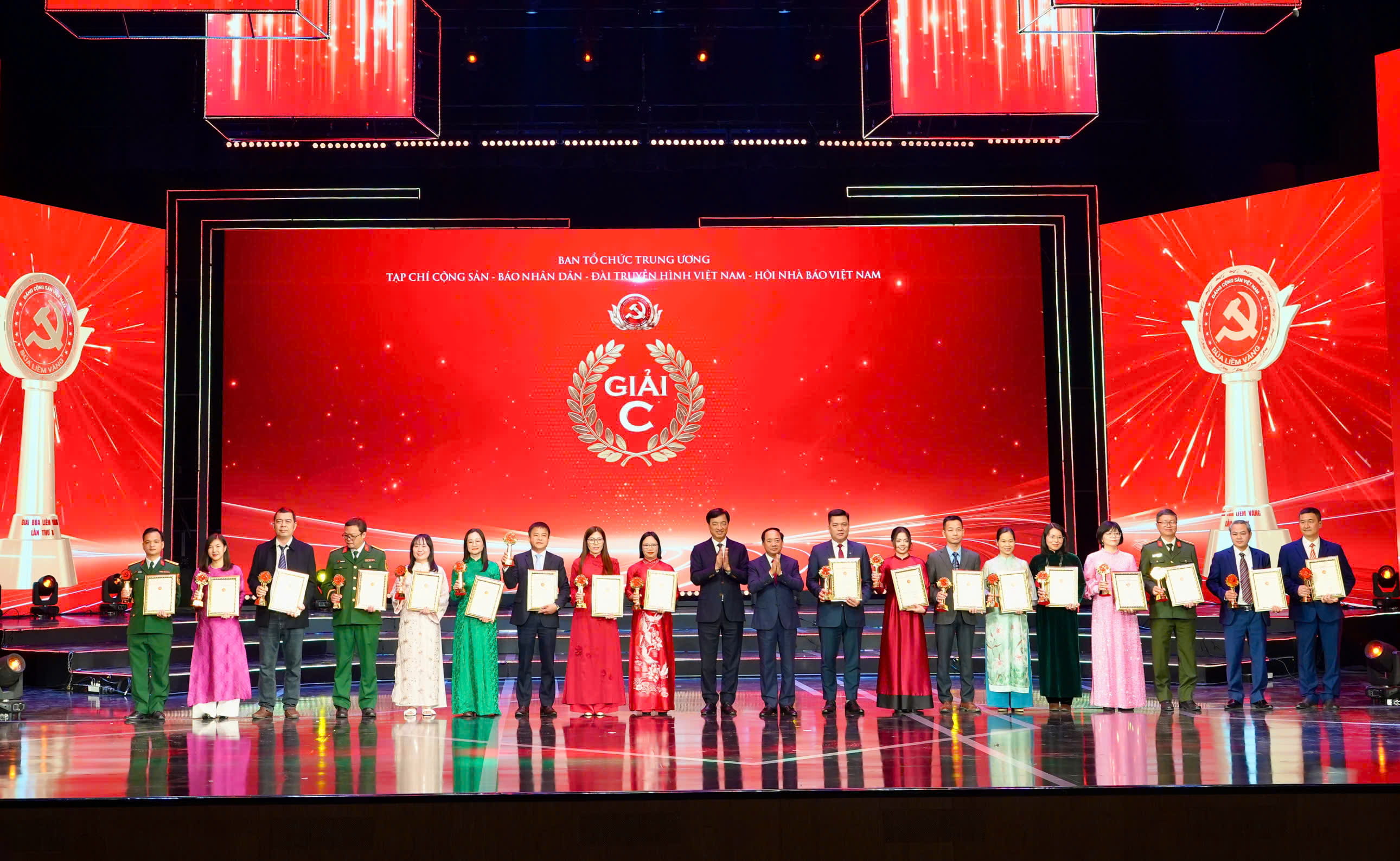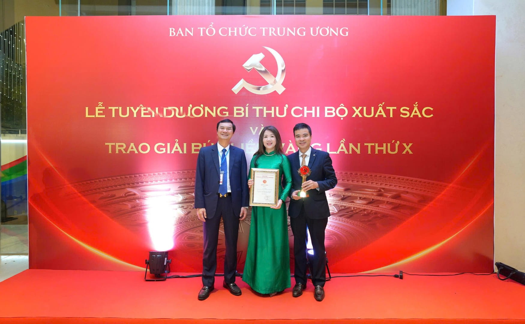Ngo Minh Tuan, Head of the Party Building Department of the Communist Review, Vice Chairman of the Preliminary Jury Council and Head of the Secretariat of the 10th Golden Sickle and Hammer Awards, congratulated and took commemorative photos with representatives of the C Prize-winning author group, including Phan Khanh Ngoc, Secretary of Cell 31 and Director of the Customer Support Centre (VCC), and Le Tien Hung, Deputy Secretary of Cell 60 and Deputy Head of the Marketing and Communications Division, for their same awarded work