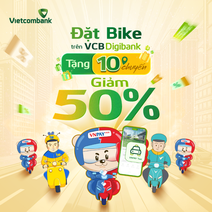 Giảm ngay 50% giá chuyến khi gọi Bike (xe máy) trên VCB Digibank.