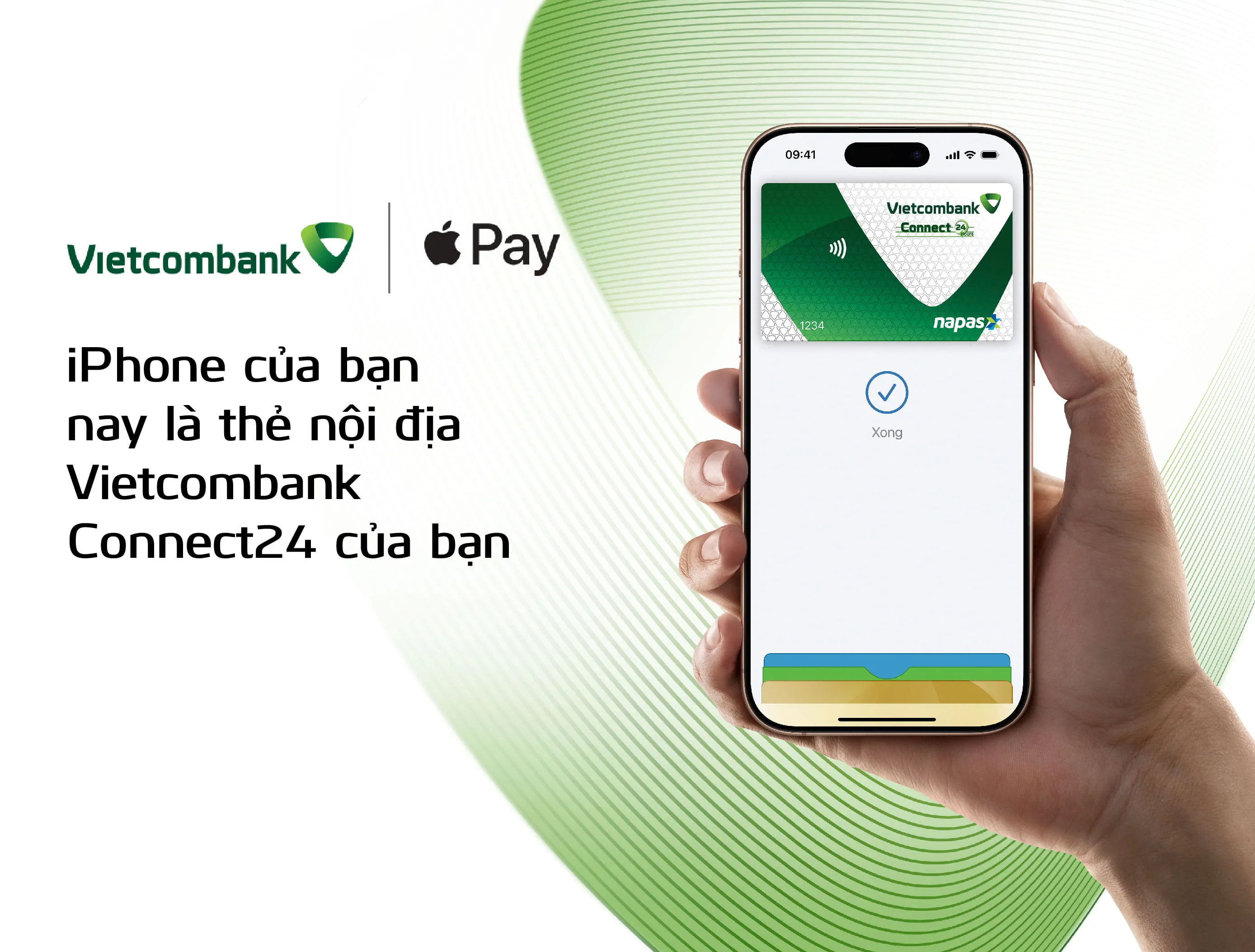 HÀ NỘI, ngày 15 tháng 4 năm 2025 — Ngân hàng TMCP Ngoại Thương Việt Nam (Vietcombank) chính thức giới thiệu Apple Pay đến với chủ thẻ nội địa Vietcombank Connect24 (chủ thẻ Vietcombank NAPAS) tại Việt Nam. Apple Pay là phương thức thanh toán dễ dàng, an toàn và riêng tư khi thanh toán tại cửa hàng, trong ứng dụng và trực tuyến.
