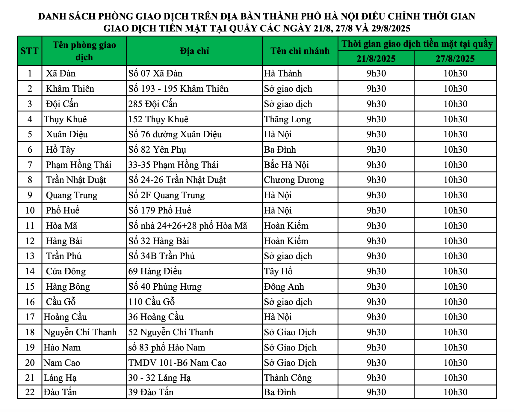 Căn cứ thông báo của Công an Thành phố Hà Nội về thời gian cấm triệt để các phương tiện lưu thông (trừ xe có phù hiệu bảo vệ, xe phục vụ lễ kỷ niệm) trong tháng 8/2025 tại Hà Nội để phân luồng giao thông phục vụ Lễ kỷ niệm 80 năm Cách mạng Tháng Tám và Quốc khánh 2/9, Vietcombank thông báo điều chỉnh thời gian giao dịch tiền mặt tại một số phòng giao dịch (PGD) như sau: