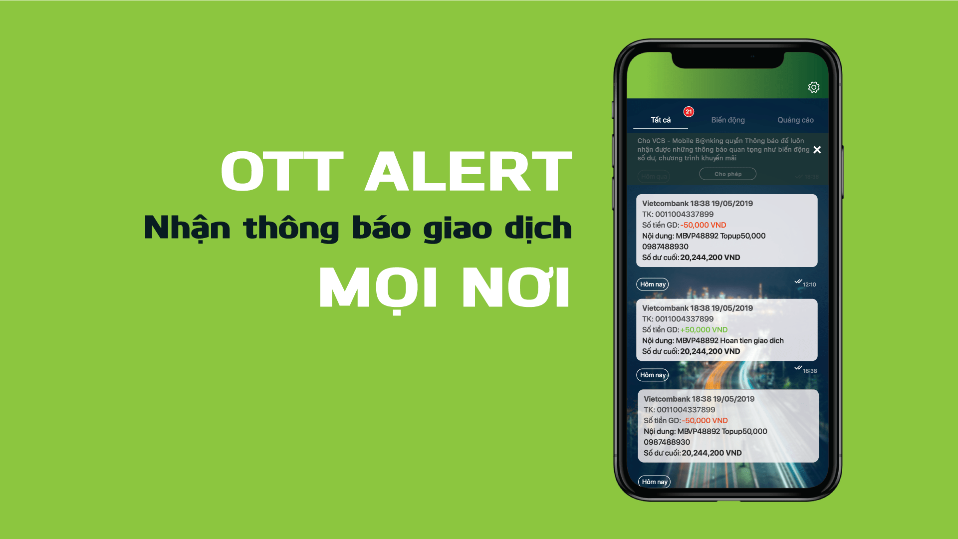 OTT Alert giúp khách hàng kiểm soát thay đổi số dư tài khoản ngân hàng 24/24 tại bất cứ đâu chỉ với một chiếc điện thoại có kết nối Internet và cài đặt ứng dụng VCB Digibank. Nỗi lo không nhận được thông tin thay đổi số dư khi đi công tác hay du lịch nước ngoài đã không còn làm khó được khách hàng Vietcombank. Ngoài thông báo thay đổi số dư tài khoản, OTT Alert còn thông báo khi khách hàng chi tiêu thẻ, nhắc lịch trả nợ định kỳ và các thông báo khác theo quy định của Vietcombank từng thời kỳ.