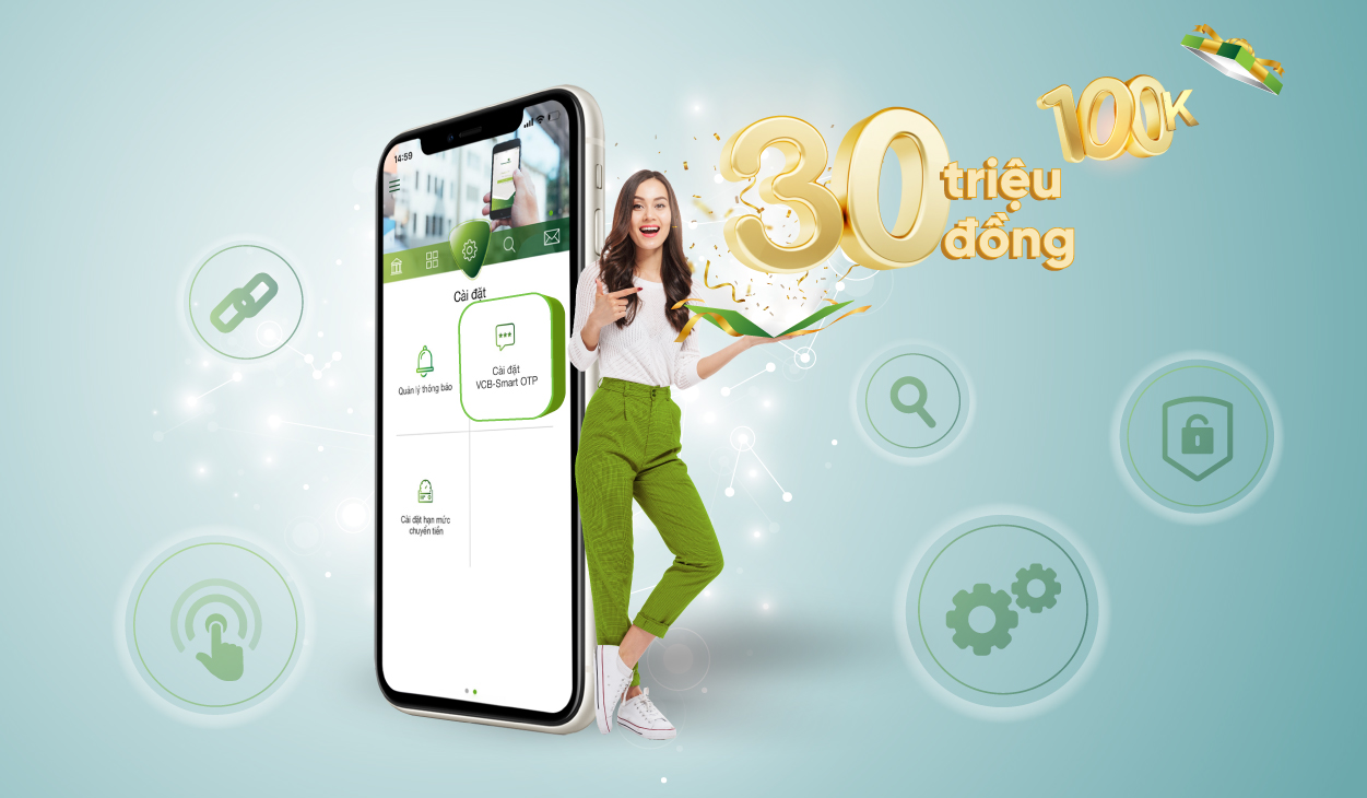 - Quà tặng hàng tuần: Tặng Mã giảm giá (E-Voucher) thanh toán QR Code trị giá 100.000 VND cho 200 KH đầu tiên đăng ký Smart OTP tích hợp trên ứng dụng VCB-Mobile Banking và có tối thiểu 10 giao dịch tài chính sử dụng Smart OTP trong mỗi tuần.