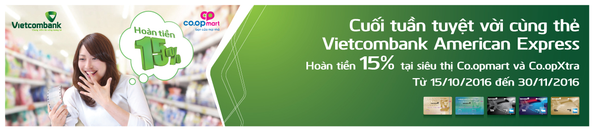 Vietcombank xin chúc mừng các Quý khách hàng đã trúng thưởng Chương trình khuyến mãi "Cuối tuần tuyệt vời cùng thẻ Vietcombank American Express" – Ưu đãi tại siêu thị Co.opmart và Co.opXtra dành cho các chủ thẻ tín dụng Vietcombank American Express với nội dung như sau: