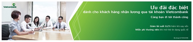 - Phạm vi ưu đãi: Áp dụng cho tất cả các hợp đồng vay phát sinh từ ngày 15/8/2016 đến khi khách hàng còn nhận lương qua tài khoản Vietcombank.