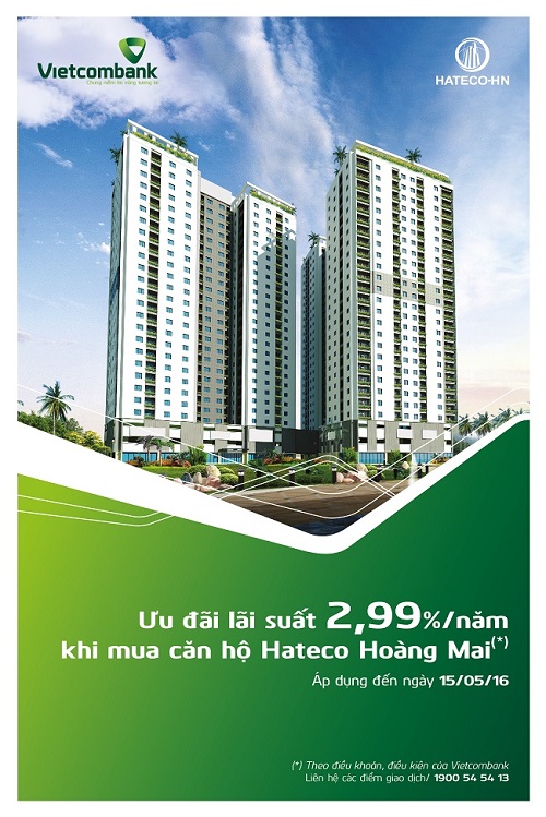 Từ tháng 02/2016, Vietcombank phối hợp với chủ đầu tư dự án Hateco Hoàng Mai triển khai chương trình ưu đãi cho khách hàng vay mua căn hộ với lãi suất chỉ từ 2,99%/năm.