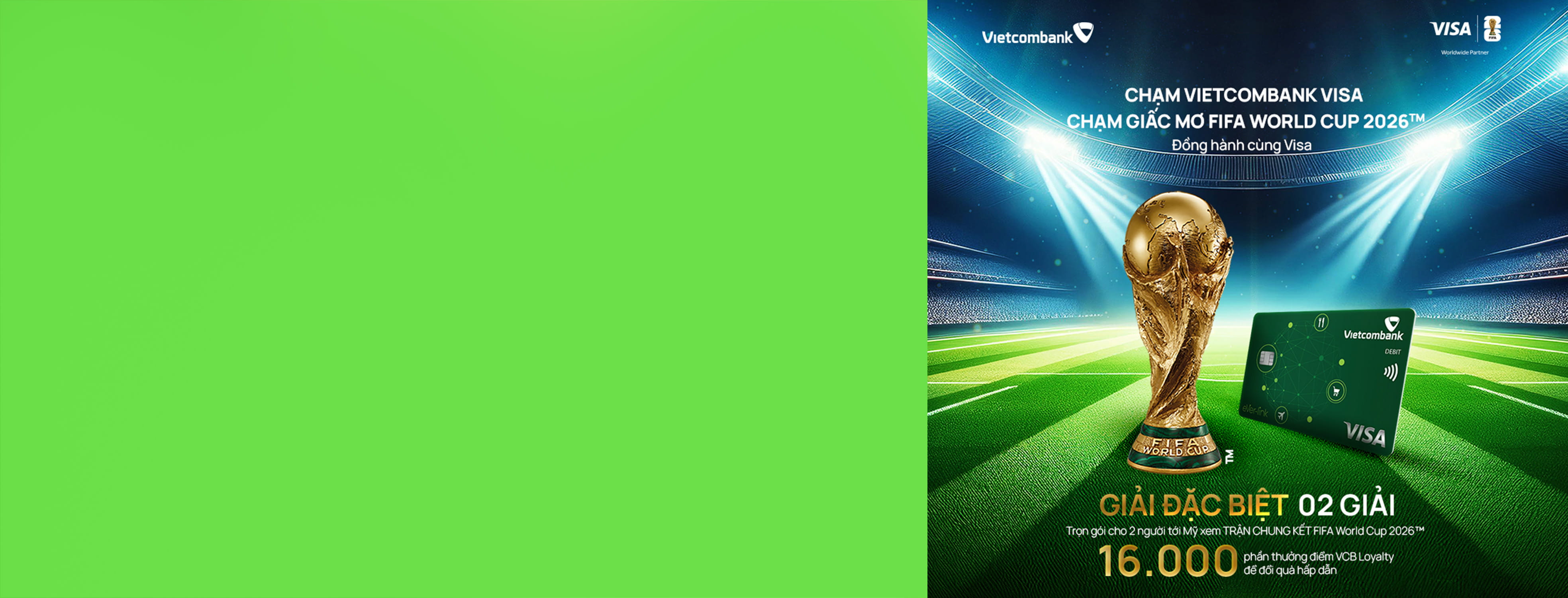 Từ những giao dịch quen thuộc, Vietcombank Visa mở ra cơ hội để người hâm mộ bóng đá chạm tới đỉnh cao cảm xúc - trực tiếp hòa mình vào không khí Chung kết FIFA World Cup 2026™, cùng hàng nghìn phần quà giá trị đang chờ đón.