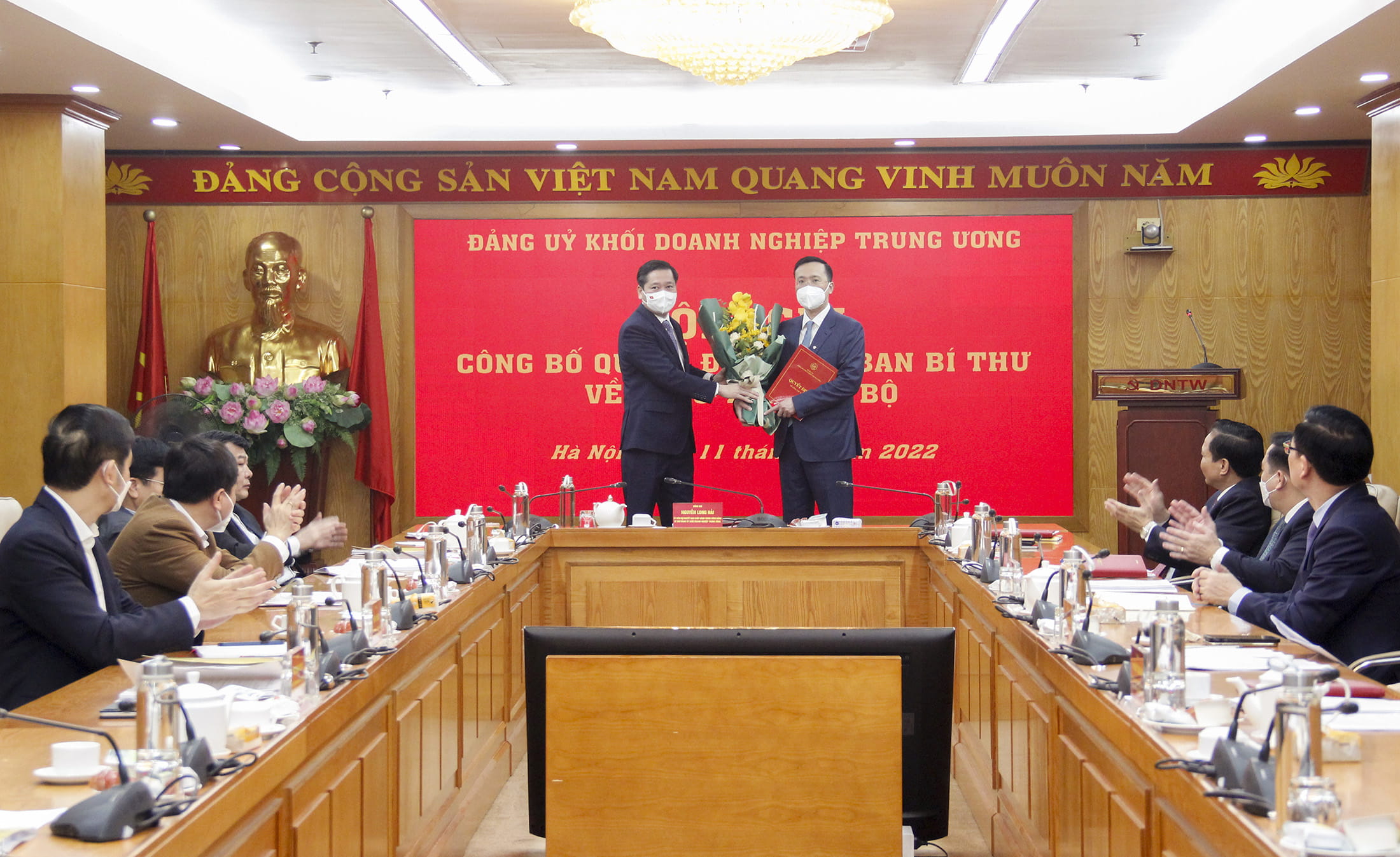 Bí thư Đảng uỷ Khối Doanh nghiệp Trung ương Nguyễn Long Hải trao quyết định và tặng hoa chúc mừng đồng chí Phạm Quang Dũng