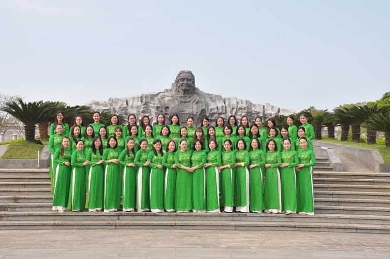 Toàn thể nữ đoàn viên, người lao động tại trụ sở Vietcombank Quảng Nam chụp hình lưu niệm bên tượng đài Mẹ VNAH Nguyễn Thị Thứ