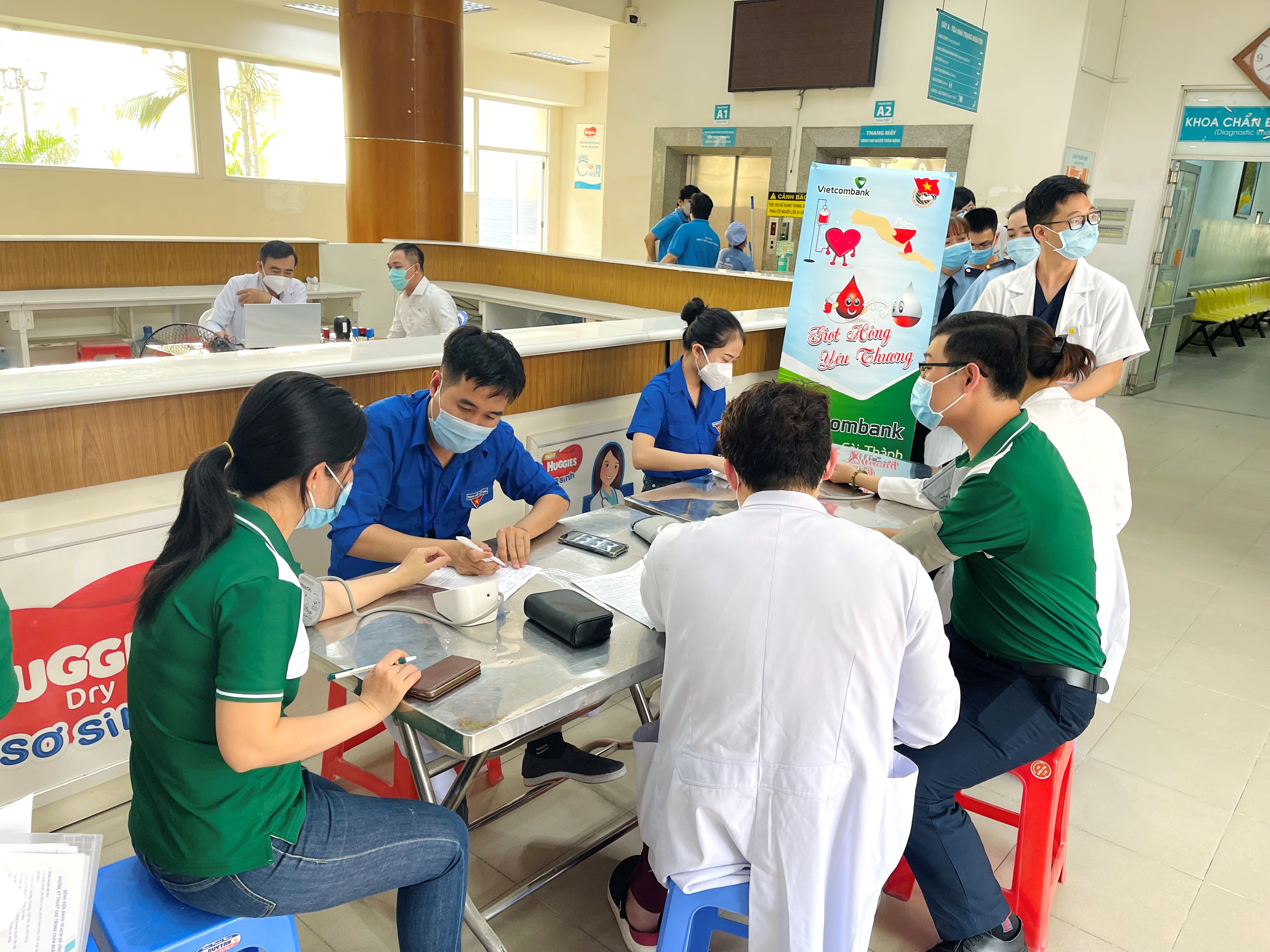 Đoàn viên thanh niên Vietcombank Sài Thành được các bác sĩ của bệnh viện Hùng Vương khám sàng lọc trước khi hiến máu