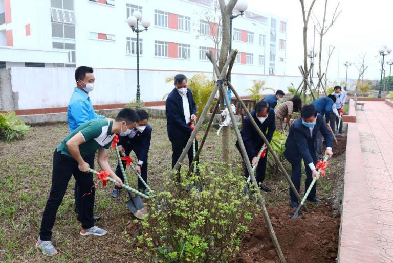 Các đại biểu Đoàn TN Vietcombank Bắc Hà Nội và huyện đoàn Hoài Đức tham gia trồng cây xanh