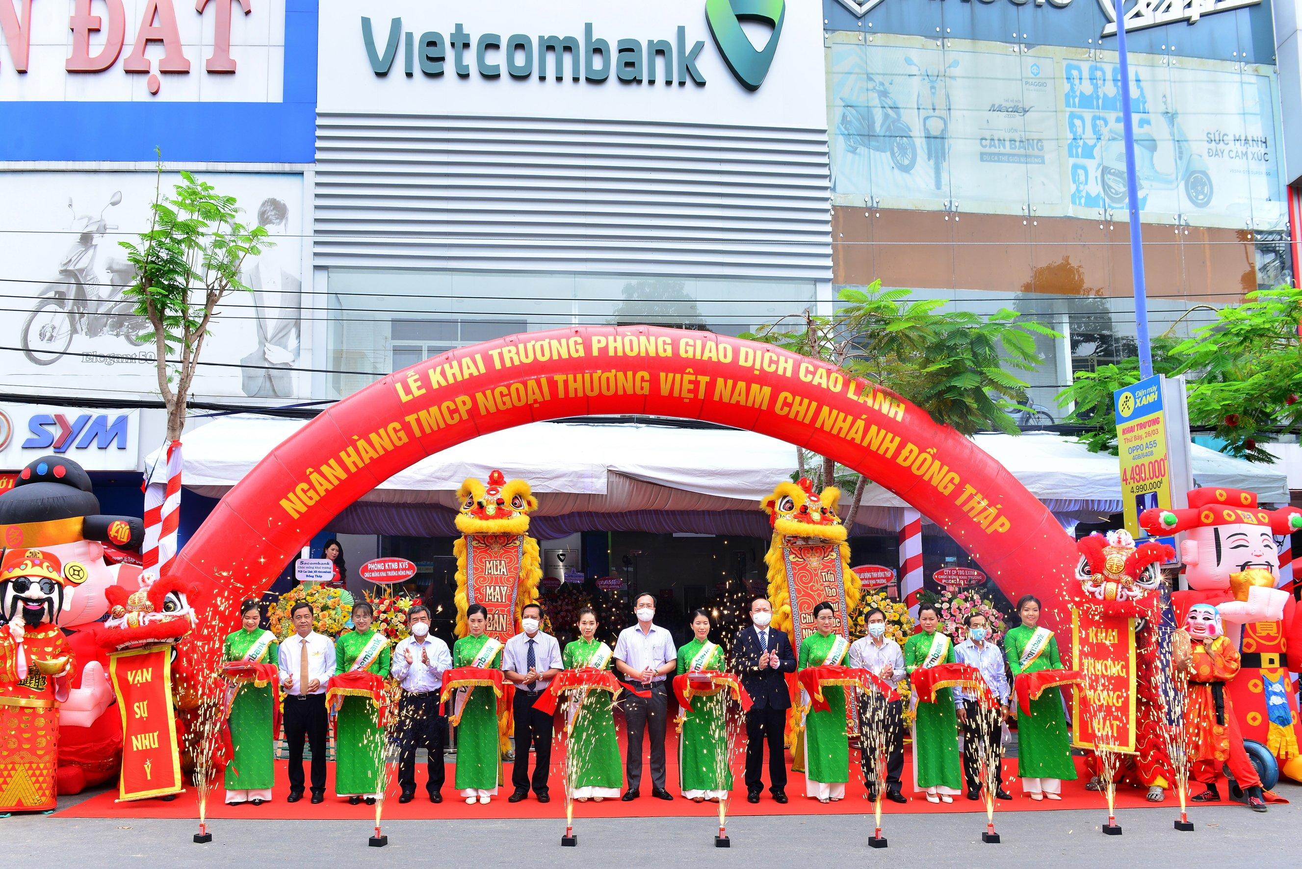 Ông Phan Duy Phúc - Giám đốc Vietcombank Đồng Tháp (thứ 6 từ trái sang) cùng đại diện lãnh đạo tỉnh và địa phương cắt băng khai trương phòng giao dịch Cao Lãnh
