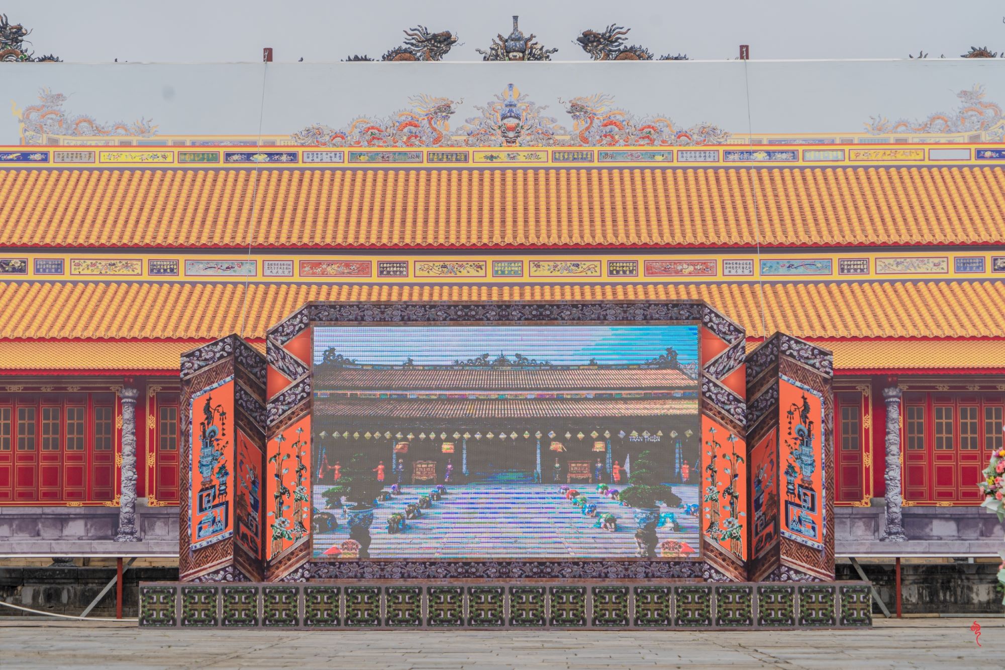 Màn hình led quảng bá thông tin tại Điện Thái Hòa do Trung tâm Bảo tồn Di tích Cố đô Huế và Vietcombank Huế phối hợp thực hiện