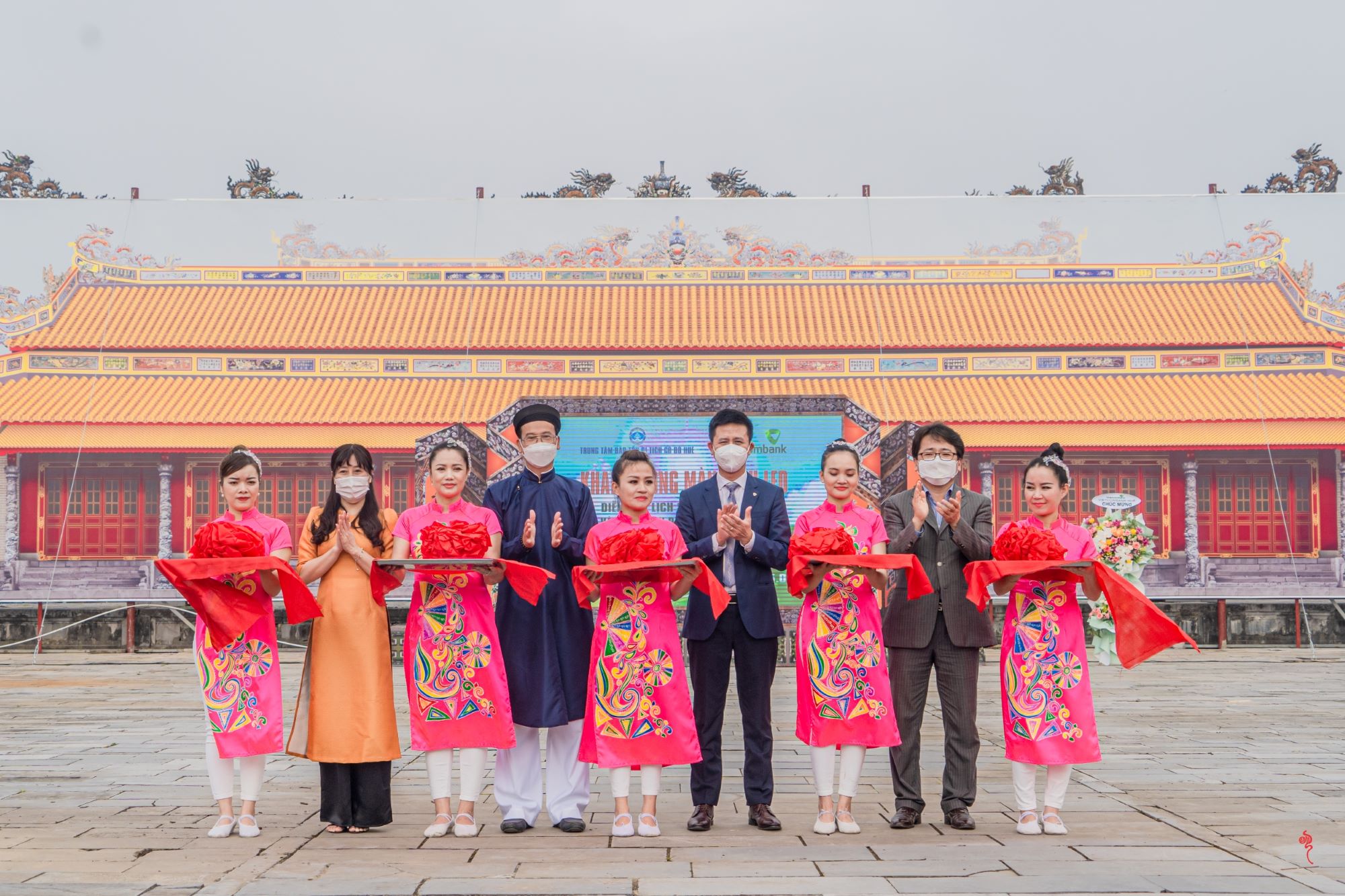Ông Lý Hoàng Vũ - Bí thư Đảng ủy, Giám đốc Vietcombank Huế (thứ tư từ phải sang) và ông Hoàng Việt Trung - Giám đốc Trung tâm Bảo tồn Di tích Cố đô Huế (thứ tư từ trái sang) cùng các đại biểu cắt băng khánh thành tại buổi lễ