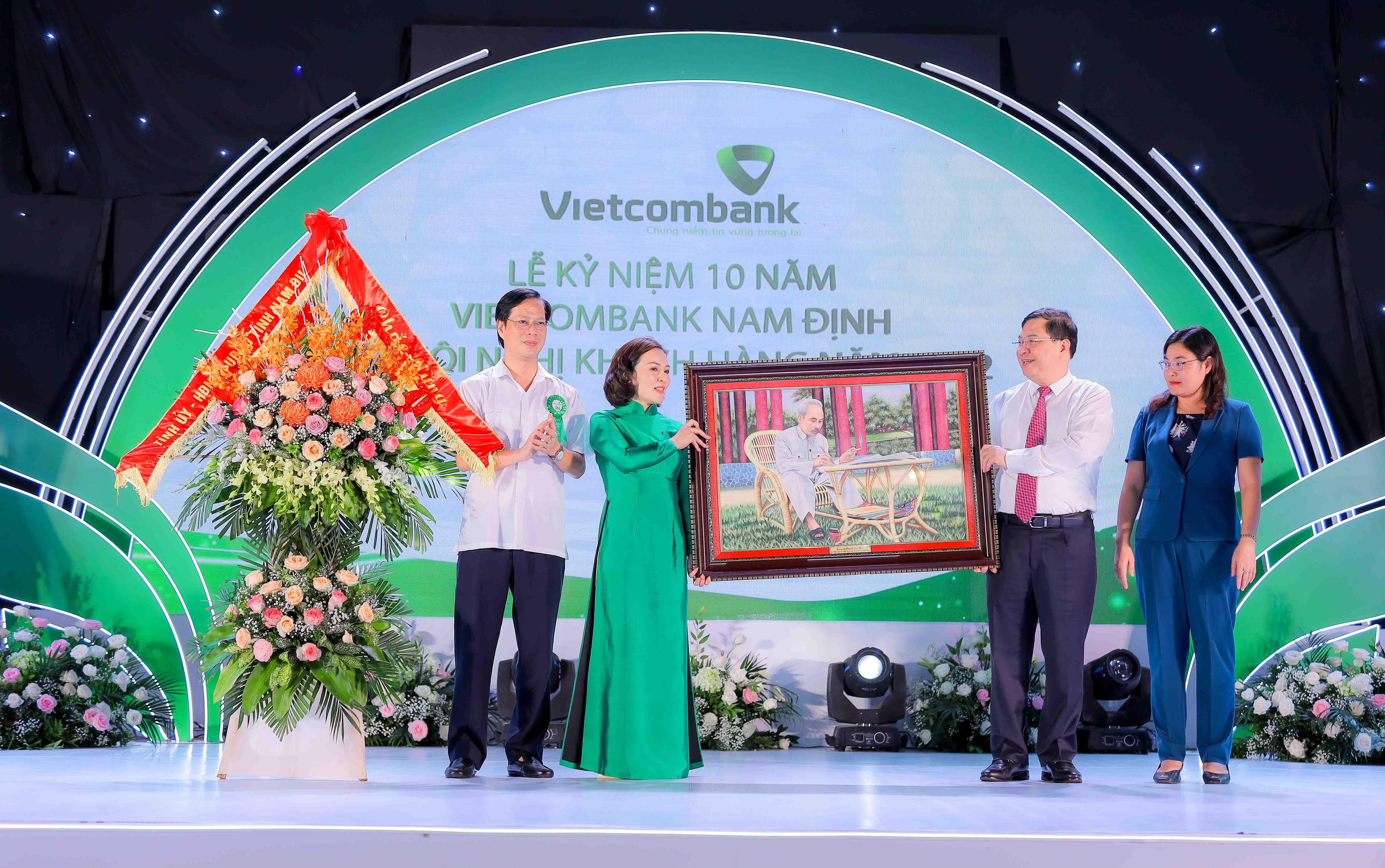 Lãnh đạo tỉnh Nam Định trao bức tranh thêu hình Chủ tịch Hồ Chí Minh làm việc tặng Chi nhánh Vietcombank Nam Định nhân dịp kỷ niệm 10 năm thành lập