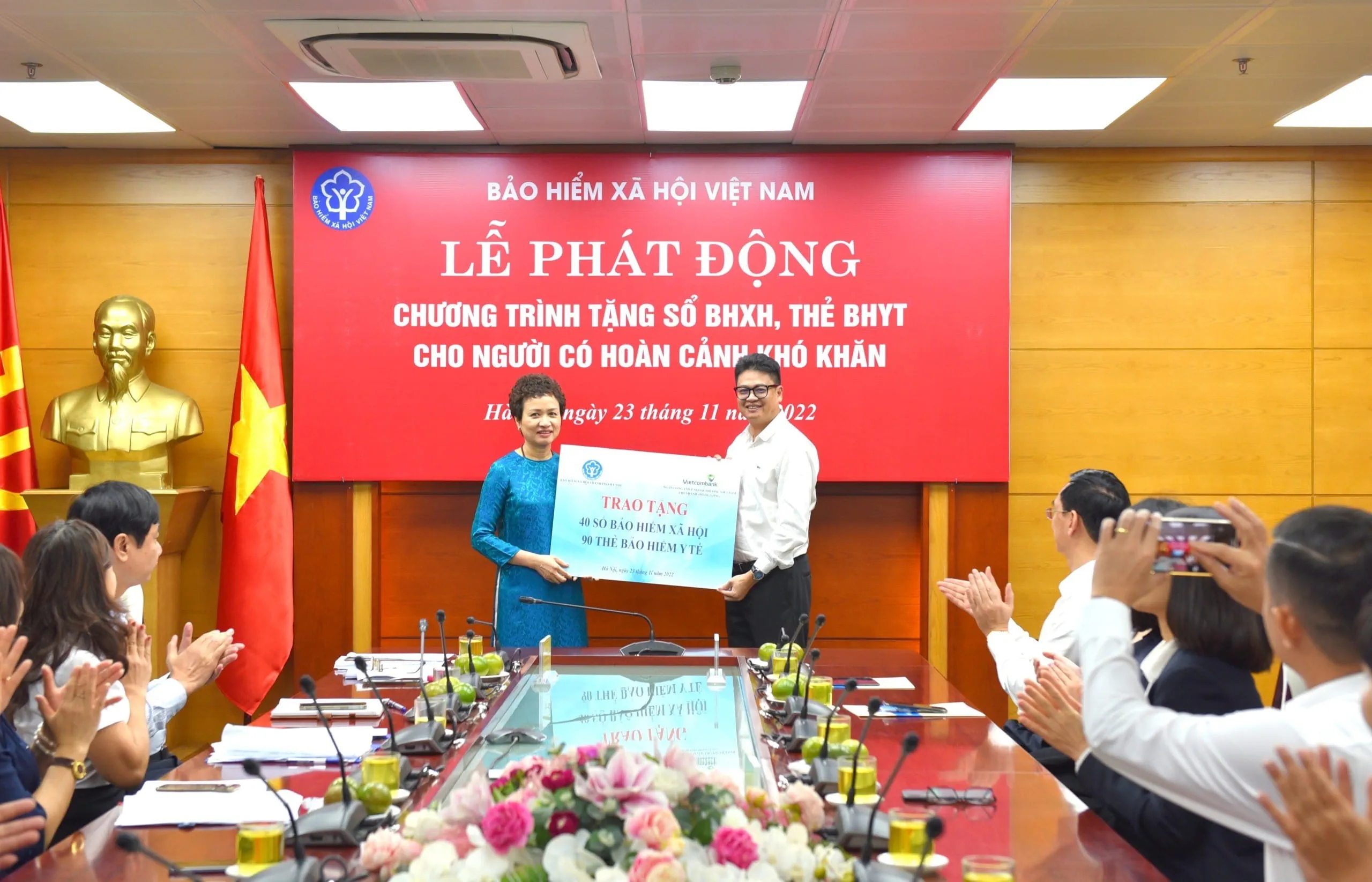 Hưởng ứng lễ phát động, tại điểm cầu BHXH TP Hà Nội, Vietcombank Thăng Long đã trao tặng cho BHXH TP Hà Nội 90 thẻ Bảo hiểm y tế (BHYT) và 40 sổ Bảo hiểm xã hội (BHXH) với tổng giá trị trên 105.678.000 đồng để gửi tới những người dân có hoàn cảnh khó khăn trên địa bàn Hà Nội.