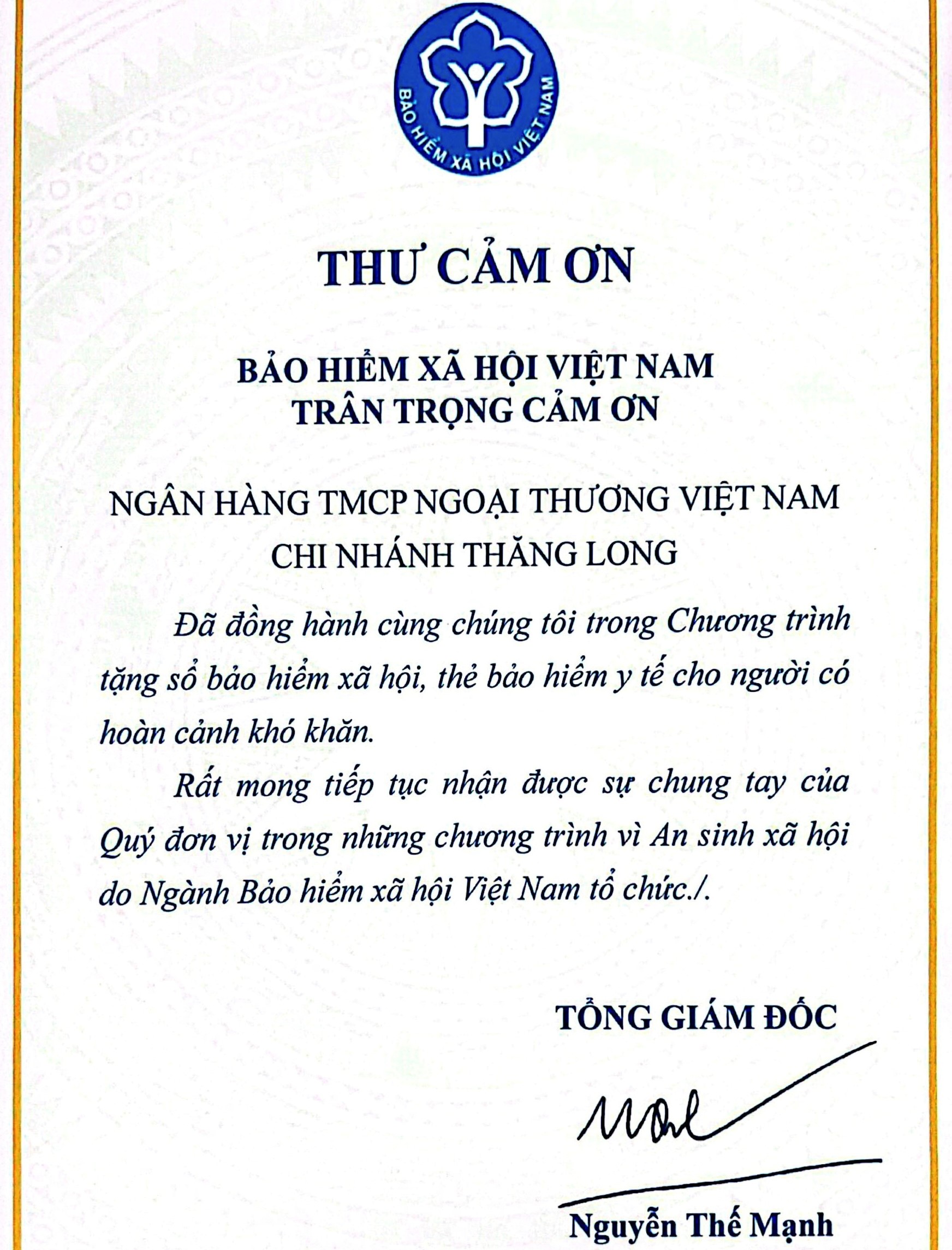Vietcombank Thăng Long nhận thư cảm ơn của Tổng Giám Đốc BHXH Việt Nam)