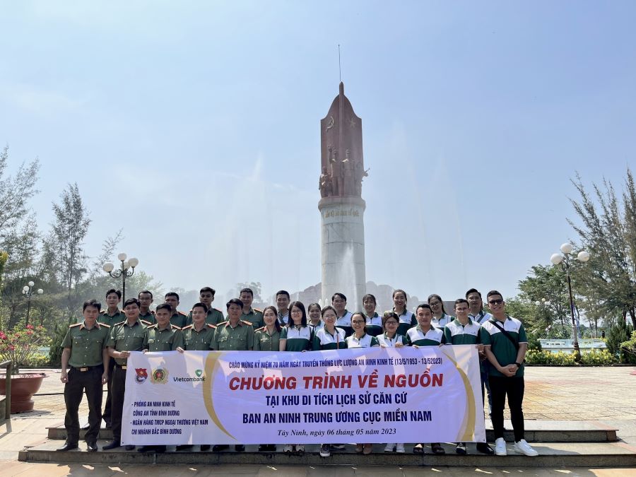 Thượng tá Nguyễn Toàn Thắng - Ủy viên BCH Đảng bộ, Phó Trưởng phòng An ninh kinh tế, Công an tỉnh Bình Dương (hàng đầu, thứ 5 từ trái sang) chụp ảnh lưu niệm cùng ĐVTN hai đơn vị tại Bia chiến thắng Khu di tích lịch sử căn cứ Ban An ninh Trung ương cục miền Nam