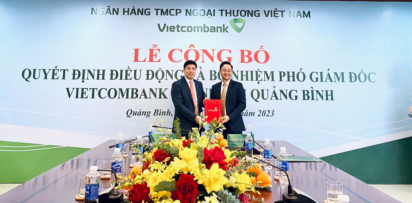 Ông Hồng Quang - Ủy viên BTV Đảng ủy Vietcombank, Thành viên HĐQT kiêm Giám đốc Khối Nhân sự trao quyết định điều động và bổ nhiệm cho ông Lê Kiên Cường - tân Phó Giám đốc Vietcombank Quảng Bình