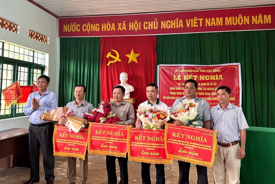 Đại diện các đơn vị, đ/c Nguyễn Thị Hương - Phó Giám đốc Sở Lao động thương binh và Xã hội đã biểu dương và ghi nhận sự nỗ lực của lãnh đạo các đơn vị trong việc tìm hiểu, trao đổi và tổ chức chương trình kết nghĩa, thể hiện sự đoàn kết gắn bó bốn đơn vị trong thời gian qua. Đồng thời đ/c Nguyễn Thị Hương cũng bày tỏ mong muốn lãnh đạo Bon Ding Lie chủ động trao đổi, thông báo tình hình của địa phương để đơn vị kết nghĩa nắm bắt tình hình và có những giải pháp hỗ trợ bà con ổn định cuộc sống, phát triển kinh tế, cùng nhau xây dựng nếp sống văn minh, thôn, làng văn hóa, để địa phương ngày càng phát triển.