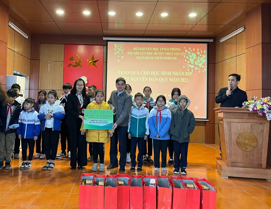 Ông Nguyễn Văn Năng - Trưởng phòng GD & ĐT huyện Thủy Nguyên (bên phải) và bà Trần Thị Hải Vân - Chủ tịch Công đoàn, Phó Giám đốc Vietcombank Đông Hải Phòng (bên trái) trao quà cho học sinh có hoàn cảnh khó khăn