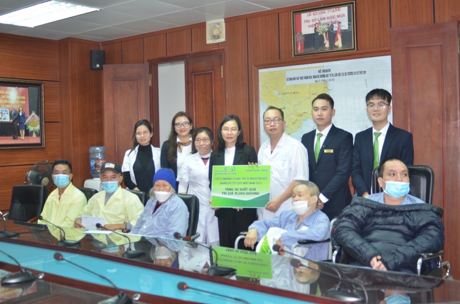 Ông Nguyễn Bảo Nam - Tiến sĩ, Viện phó Viện Y học Biển (thứ ba từ phải sang) và bà Trần Thị Hải Vân - Chủ tịch Công đoàn, Phó Giám đốc Vietcombank Đông Hải Phòng (thứ tư từ phải sang) cùng Đoàn thanh niên trao quà cho bệnh nhân nghèo