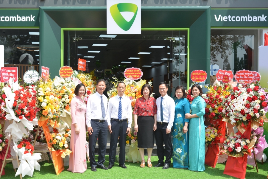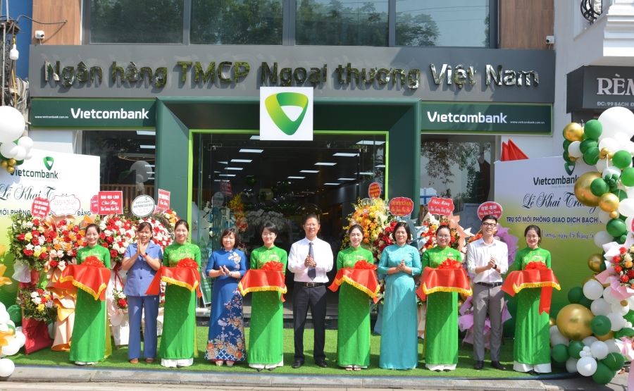 Ông Nguyễn Xuân Cao Cường - Giám đốc Vietcombank Hải Dương (đứng thứ 6 từ phải sang) cùng các đại biểu cắt băng khai trương trụ sở mới PGD Bạch Đằng