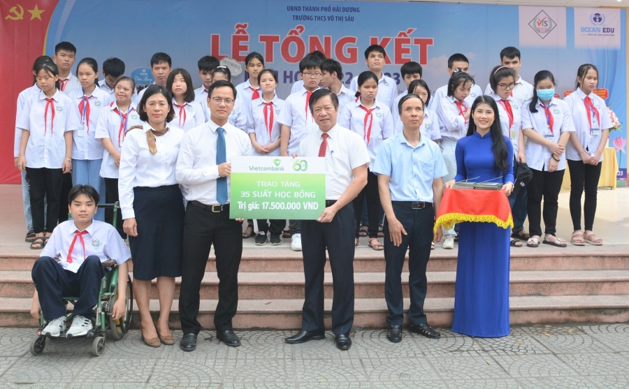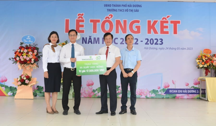 Ông Vũ Tiến Dũng - Phó giám đốc Vietcombank Hải Dương (đứng thứ hai, từ trái sang) trao biển tài trợ học bổng cho trường THCS Võ Thị Sáu