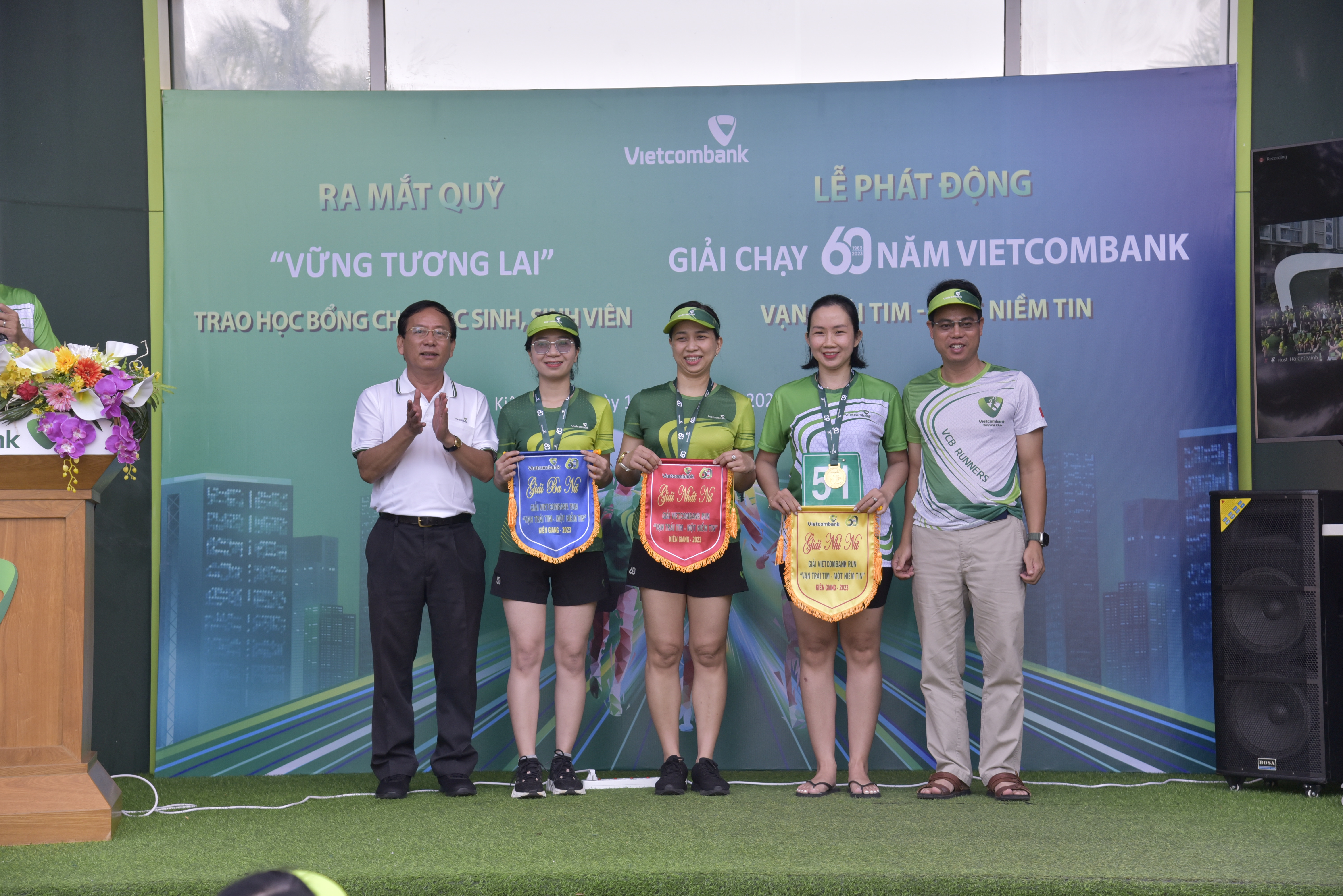 Ông Đặng Ngọc Hải - Bí thư Đảng ủy, Giám đốc Vietcombank Kiên Giang (ngoài cùng bên trái) và ông Tống Thành Chung - Phó Giám đốc Vietcombank Phú Quốc (ngoài cùng bên phải) trao giải nhất, nhì, ba cho 3 vận động viên nữ đạt thành tích nhất, nhì, ba tại giải chạy 60 năm Vietcombank.