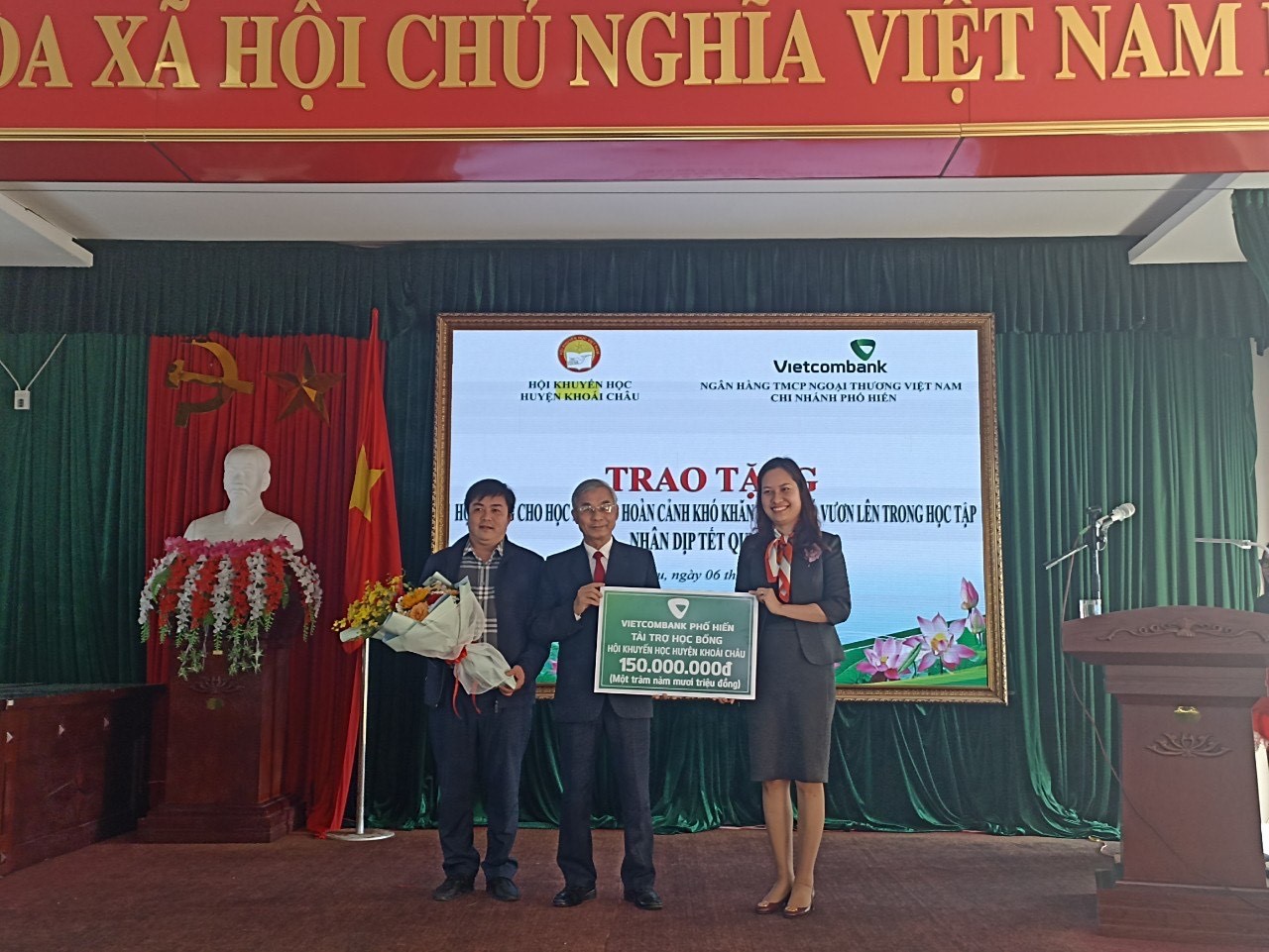 Ngày 06/01/2023, trong không khí chuẩn bị đón Tết cổ truyền Quý Mão 2023, với tinh thần “Tết ấm áp, trao yêu thương”, Vietcombank Phố Hiến và phòng Kế hoạch TSC đã phối hợp với Quỹ khuyến học huyện Khoái Châu và huyện Ân Thi, trao tặng 300 phần quà tới các em học sinh có hoàn cảnh khó khăn vươn lên trong học tập. Tổng giá trị tài trợ là 300 triệu đồng.