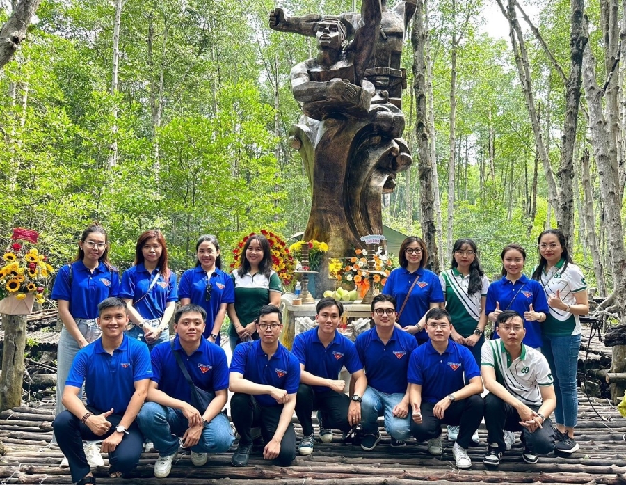 Đoàn Vietcombank Sài Thành chụp hình lưu niệm tại tượng đài chiến sĩ đặc công Rừng Sác