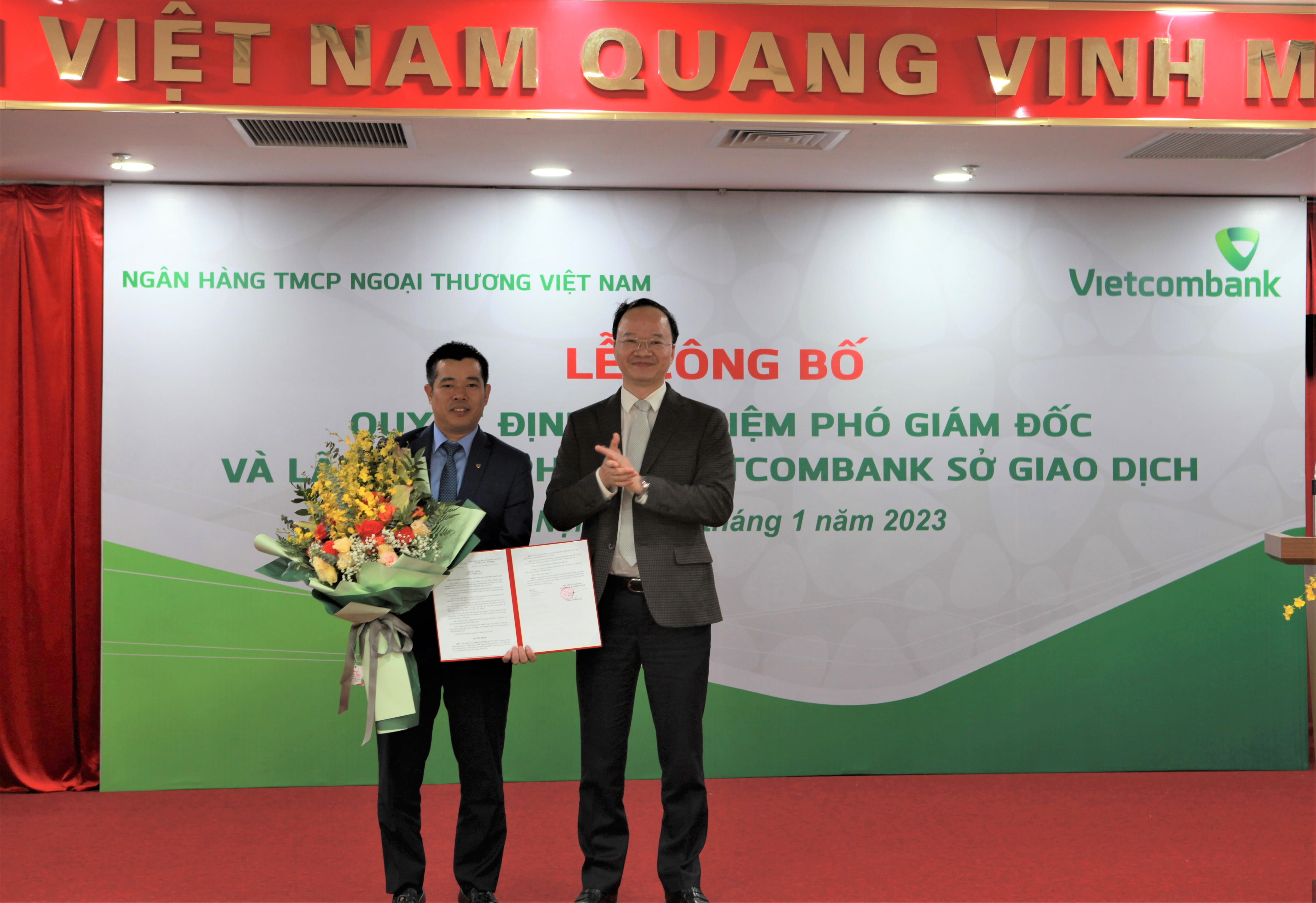 Ông Lê Quang Vinh - Ủy viên BTV Đảng ủy, Phó Tổng Giám đốc Vietcombank (bên phải) trao quyết định bổ nhiệm ông Phạm Duy Hùng giữ chức vụ Phó Giám đốc Vietcombank Sở giao dịch