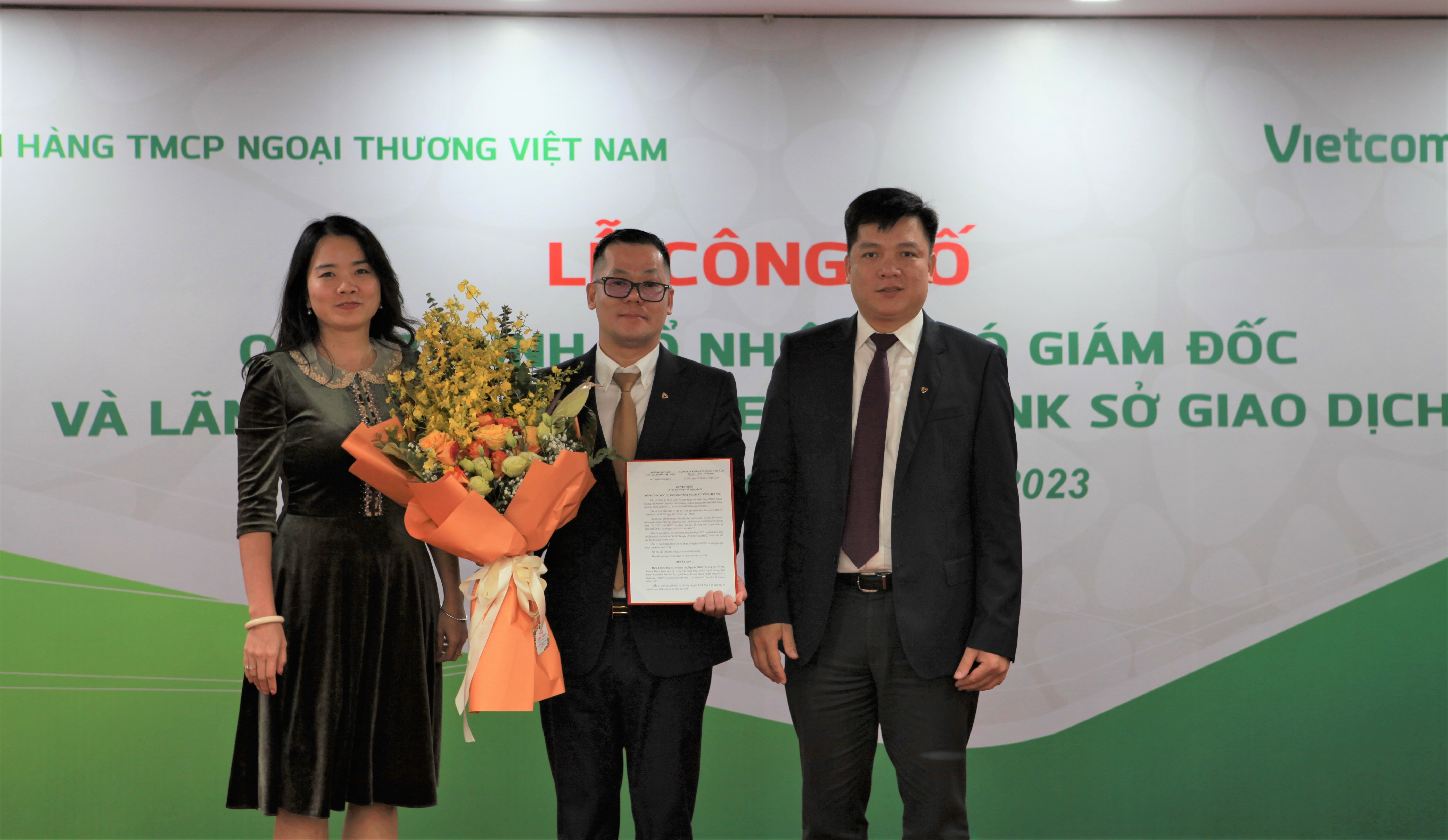 Ông Hồ Văn Tuấn - Ủy viên BCH Đảng bộ Vietcombank, Bí thư Đảng ủy, Giám đốc Sở giao dịch và bà Đinh Phương Thu Hà - Phó Giám đốc Sở giao dịch trao quyết định điều động, bổ nhiệm cho ông Nguyễn Minh Thọ