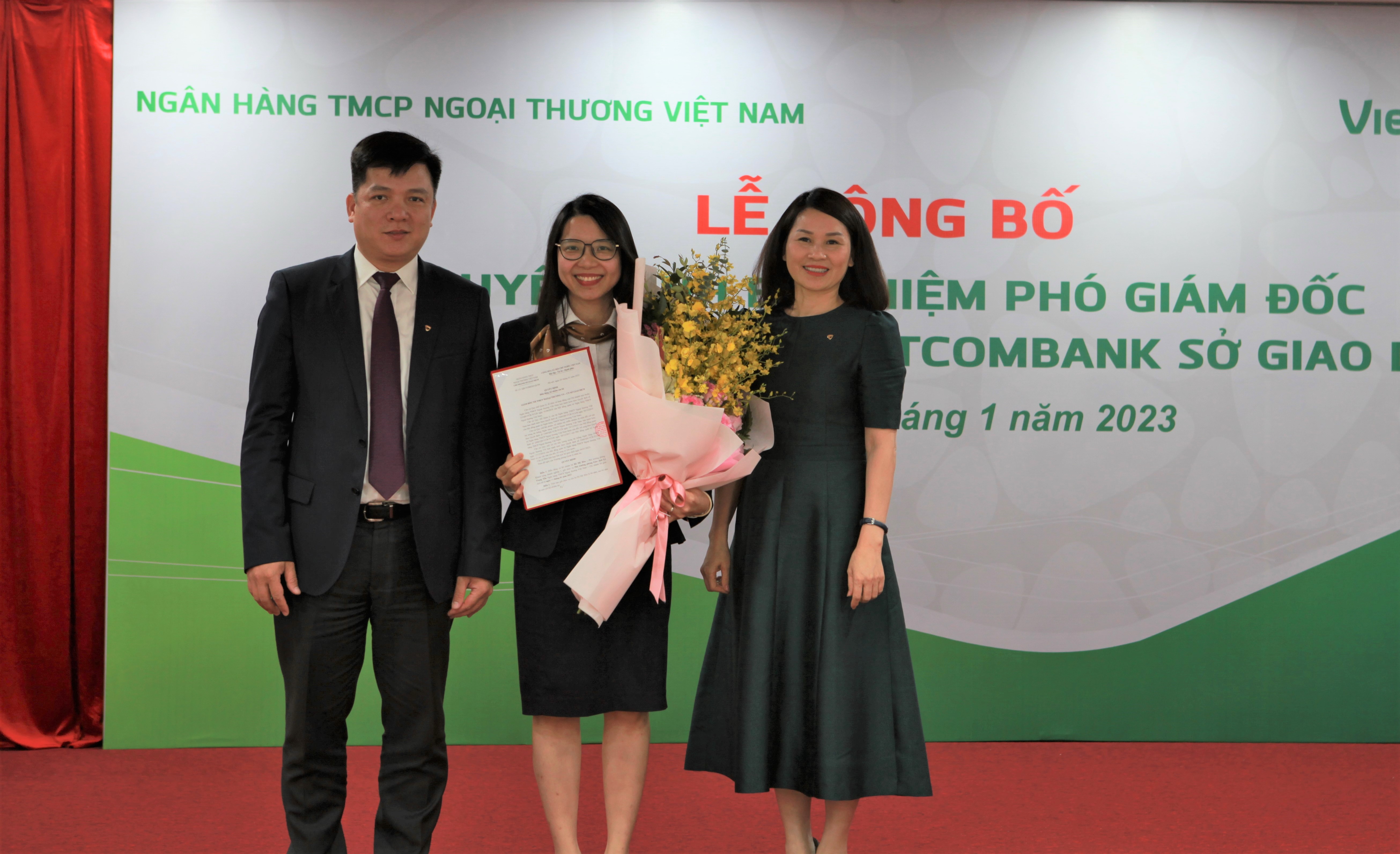 Ông Hồ Văn Tuấn - Ủy viên BCH Đảng ủy Vietcombank, Bí thư Đảng ủy, Giám đốc Sở giao dịch và bà Vũ Thị Ngọc Dung - Phó Giám đốc Sở giao dịch trao quyết định điều động, bổ nhiệm cho bà Hà Mỹ Hòa