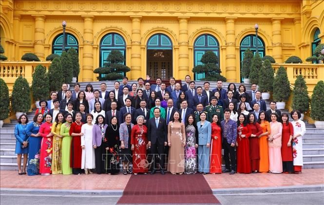 Phó Chủ tịch nước, Chủ tịch Hội đồng Bảo trợ Quỹ Bảo trợ trẻ em Việt Nam Võ Thị Ánh Xuân; Bộ trưởng Bộ LĐTB&XH Đào Ngọc Dung và các đại biểu chụp ảnh kỷ niệm tại Phủ Chủ tịch (Thành viên HĐQT Vietcombank Hồng Quang đứng hàng 5 ngoài cùng bên trái) - Ảnh: Văn Điệp (TTXVN)