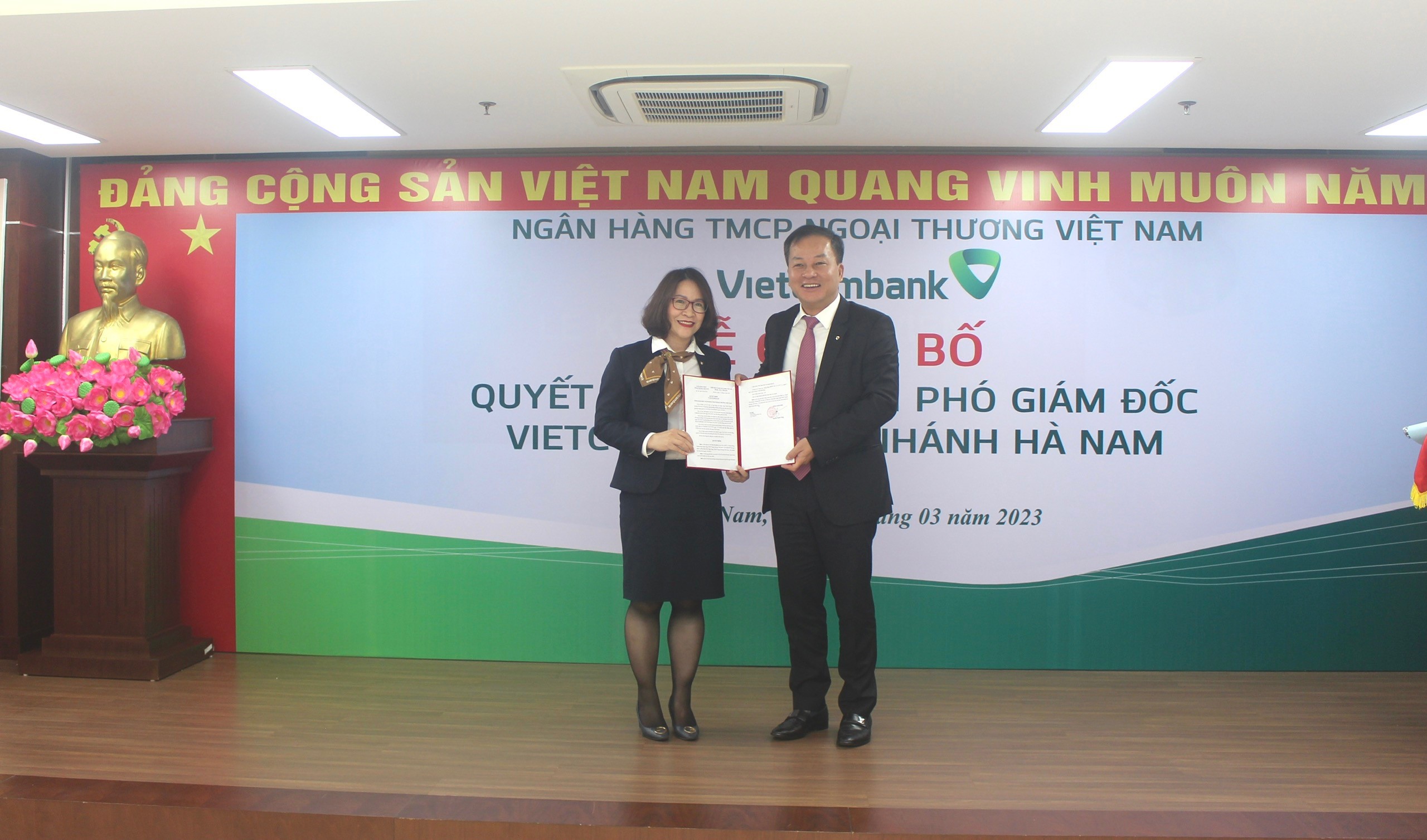 Tại buổi lễ, đại diện Ban Tổ chức và Nhân sự đã công bố quyết định số 345/QĐ-VCB-TCNS ngày 17/03/2023 của Tổng Giám đốc về việc bổ nhiệm bà Vũ Thị Thu Hà - Trưởng phòng khách hàng Vietcombank Hà Nam giữ chức vụ Phó Giám đốc Vietcombank Hà Nam kể từ ngày 19/03/2023.