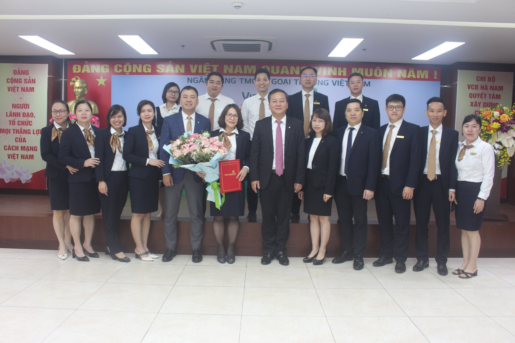 Đại diện Ban lãnh đạo Vietcombank, Ban Giám đốc Vietcombank Hà Nam và một số lãnh đạo chủ chốt của chi nhánh chụp ảnh lưu niệm cùng tân Phó Giám đốc Vietcombank Hà Nam