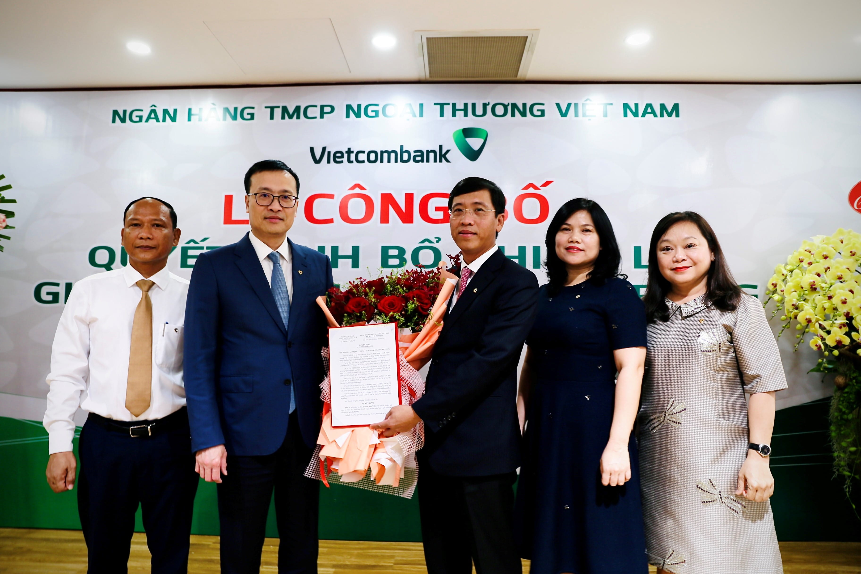 Ông Phạm Quang Dũng - Ủy viên Ban Thường vụ Đảng ủy Khối Doanh nghiệp Trung ương, Bí thư Đảng ủy, Chủ tịch Hội đồng quản trị (ngoài cùng bên trái) trao quyết định bổ nhiệm lại ông Trương Anh Tuấn - Giám đốc Vietcombank Kỳ Đồng