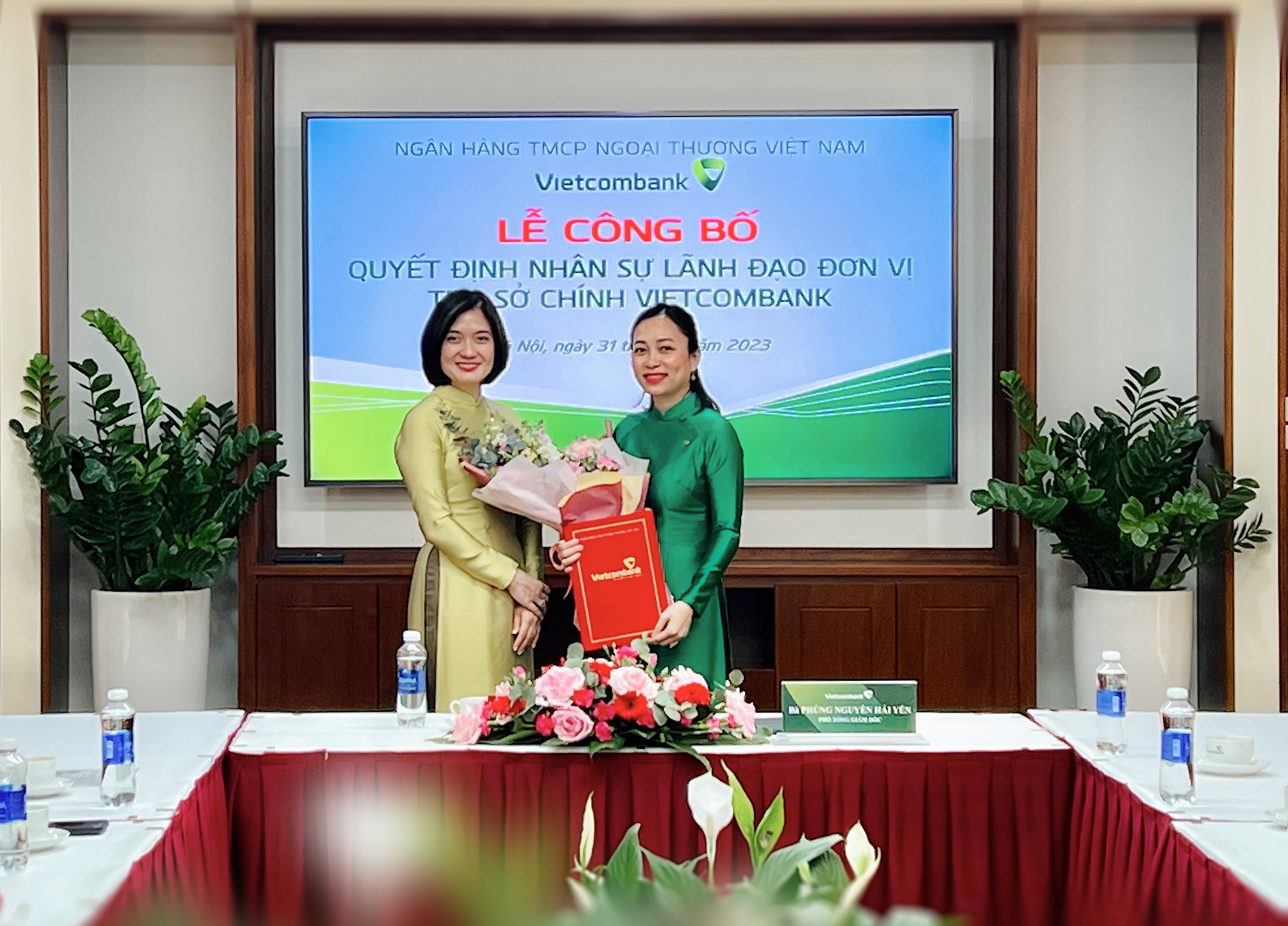 Bà Phùng Nguyễn Hải Yến - Phó Tổng Giám đốc Vietcombank (bên trái) trao quyết định điều động và bổ nhiệm cho bà Trần Hồng Nhung - Phó Giám đốc Trung tâm Xử lý tiền mặt Vietcombank