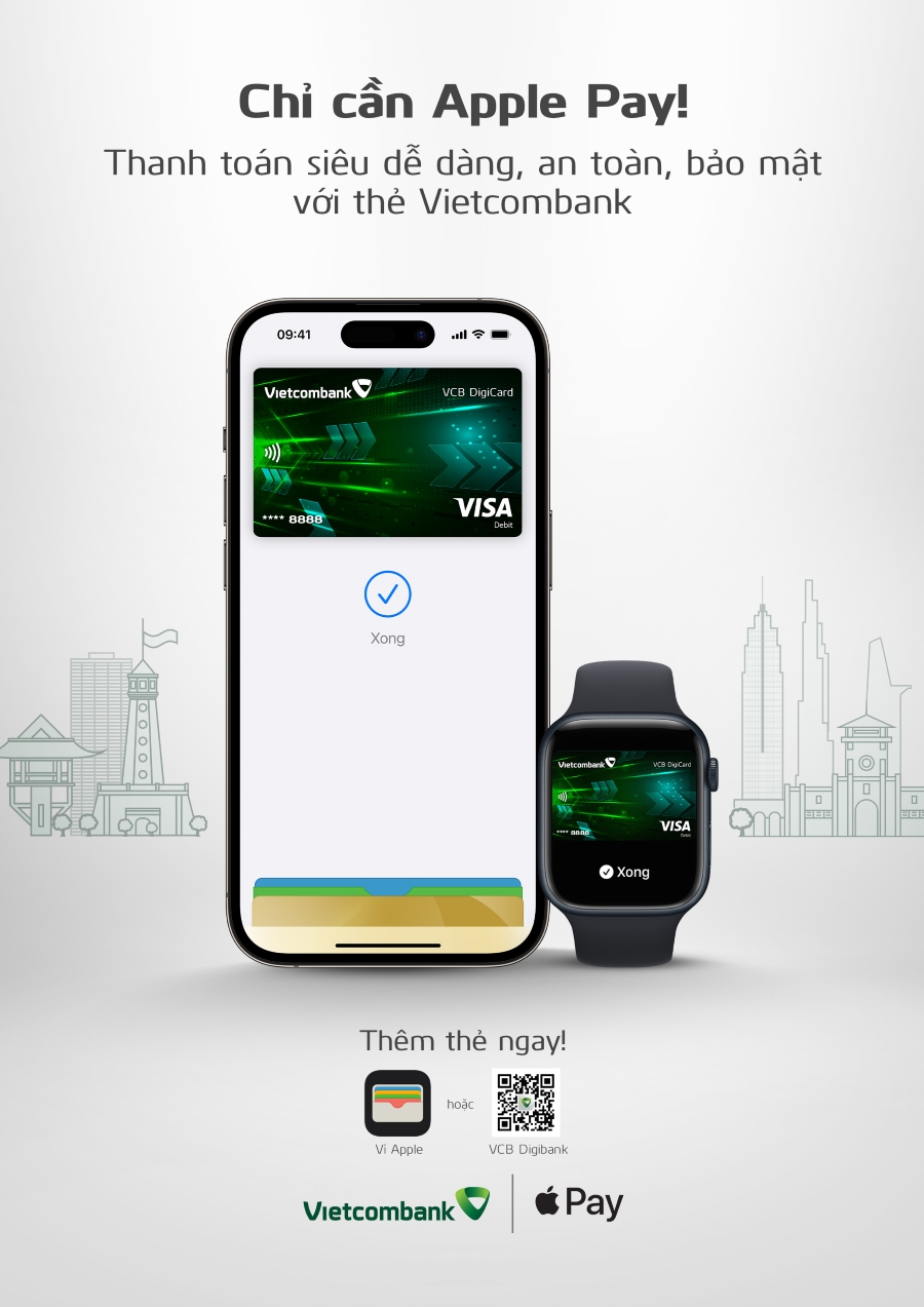 Hà Nội - ngày 08 tháng 08 năm 2023 - Ngân hàng thương mại cổ phần Ngoại thương Việt Nam (Vietcombank) hôm nay chính thức giới thiệu đến chủ thẻ Visa Apple Pay, một phương thức thanh toán an toàn, bảo mật và riêng tư hơn giúp khách hàng tránh việc đưa thẻ thanh toán cho người khác, chạm vào các nút thanh toán vật lý hoặc trao đổi tiền mặt - và sử dụng iPhone để bảo vệ mọi giao dịch.