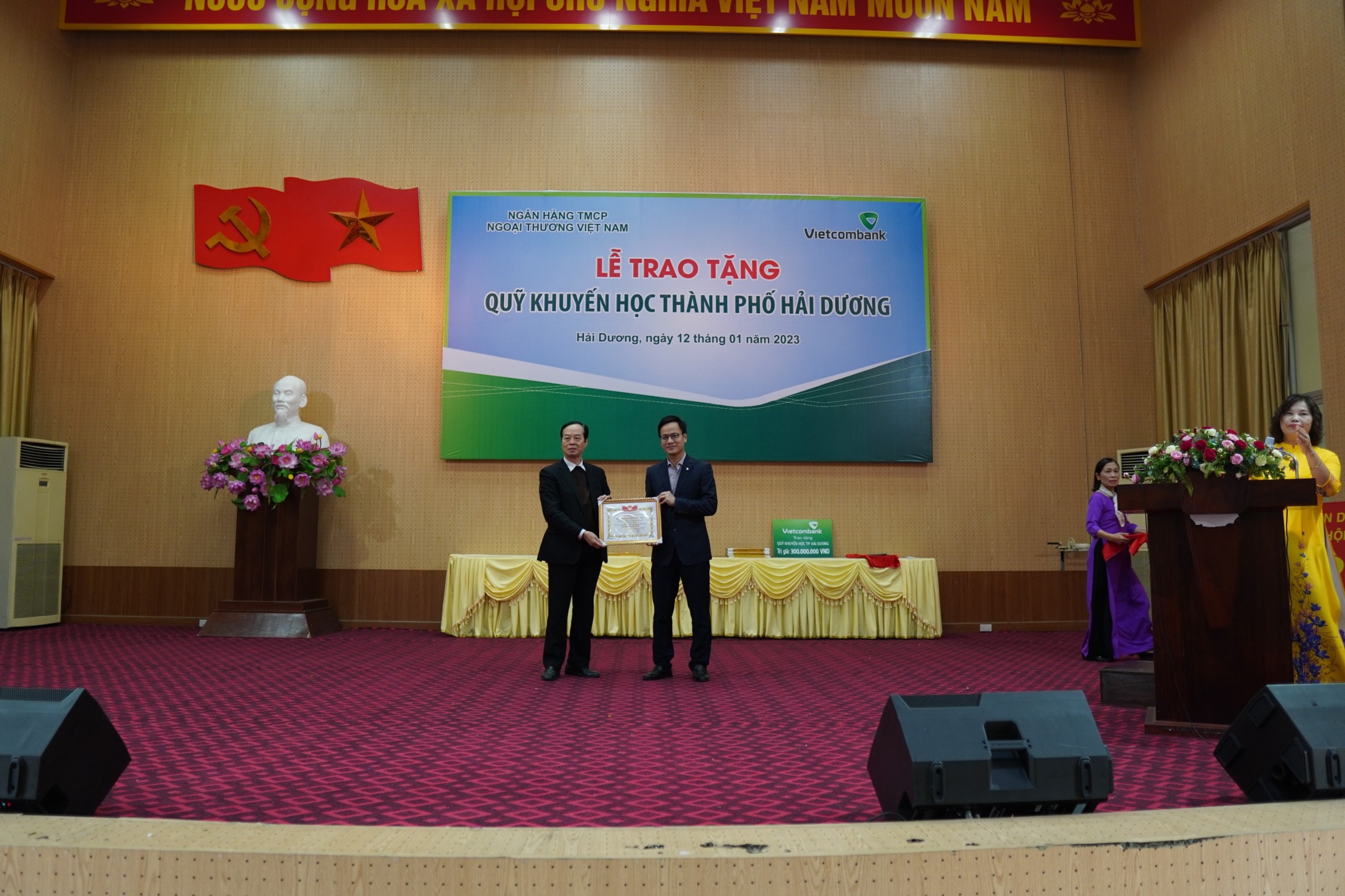 Cũng nhân dịp này, Chủ tịch Hội khuyến học tỉnh Hải Dương đã trao chứng nhận bảng vàng khuyến học cho Vietcombank Hải Dương do đã có nhiều đóng góp cho công tác khuyến học khuyến tài trên địa bàn tỉnh..