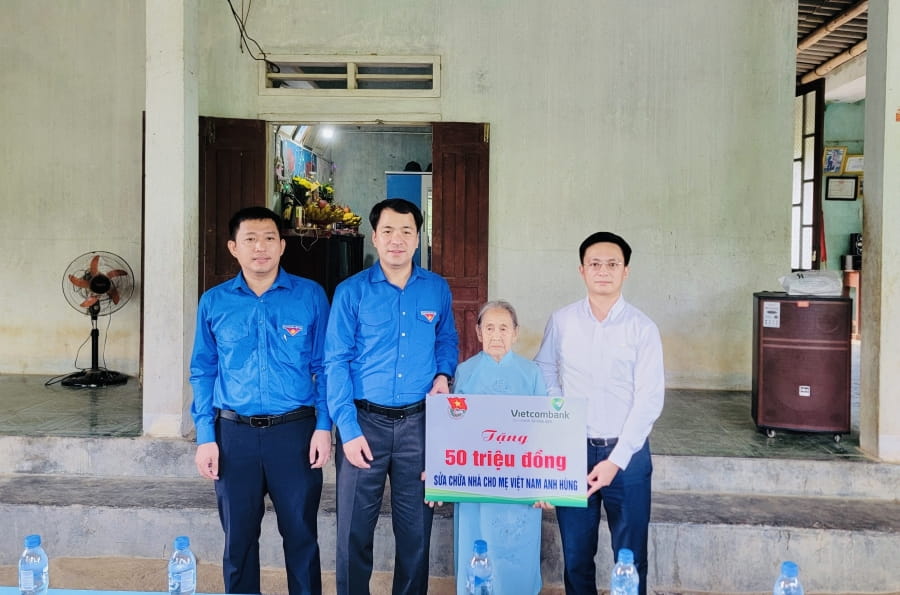 Đ/c Lê Việt Hoàng - Phó Giám đốc, Chủ tịch Công đoàn Vietcombank Sở giao dịch (ngoài cùng bên phải) trao tặng kinh phí sửa chữa nhà cho Mẹ Việt Nam Anh hùng Phạm Thị Yết tại xã Nghĩa Thắng, huyện Tư Nghĩa